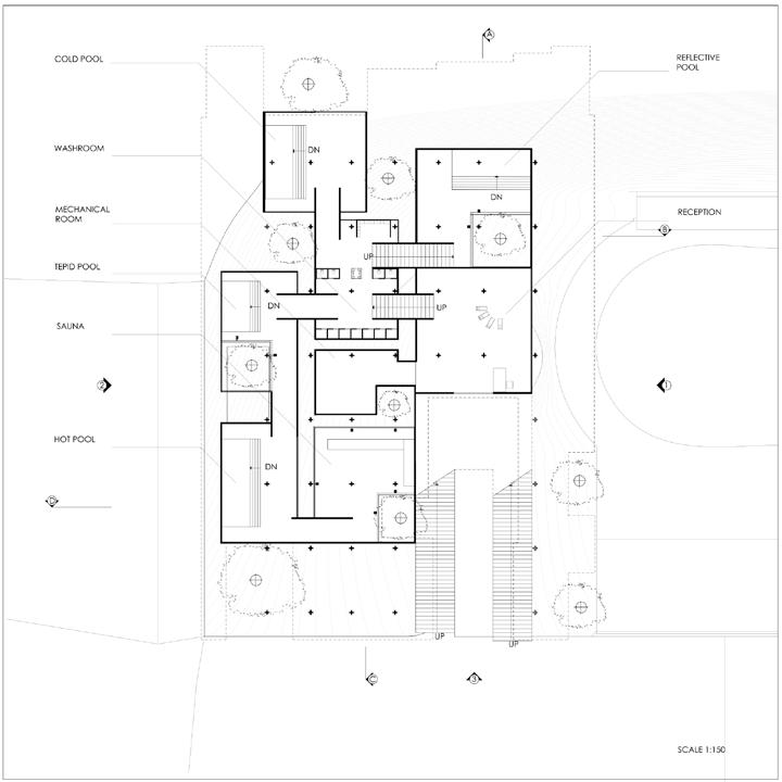As you might have taken a hint from the name, each program has been completely isolated from one another, creating a clear distinction between solid and void, volume and circulation. It still continues to follow the basic nuances of a bath-house and how you can only access the pool after going through a check in the reception and using the showers thereafter. As you can see in the reflection pool and sauna, attempts have been made to direct people towards the existing vegetation before walking in a room, essentially working as a decoy show and reveal system.