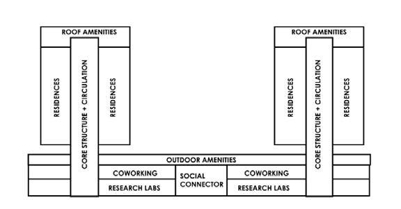 The double loaded corridor is zig-zag and not straight, so that the occupant is continuously turning and can “randomly” run into people, and brainstorm ideas off of one another. The voids in the roof and floor plates help with lighting up the corridor and ventilating through the entire building.