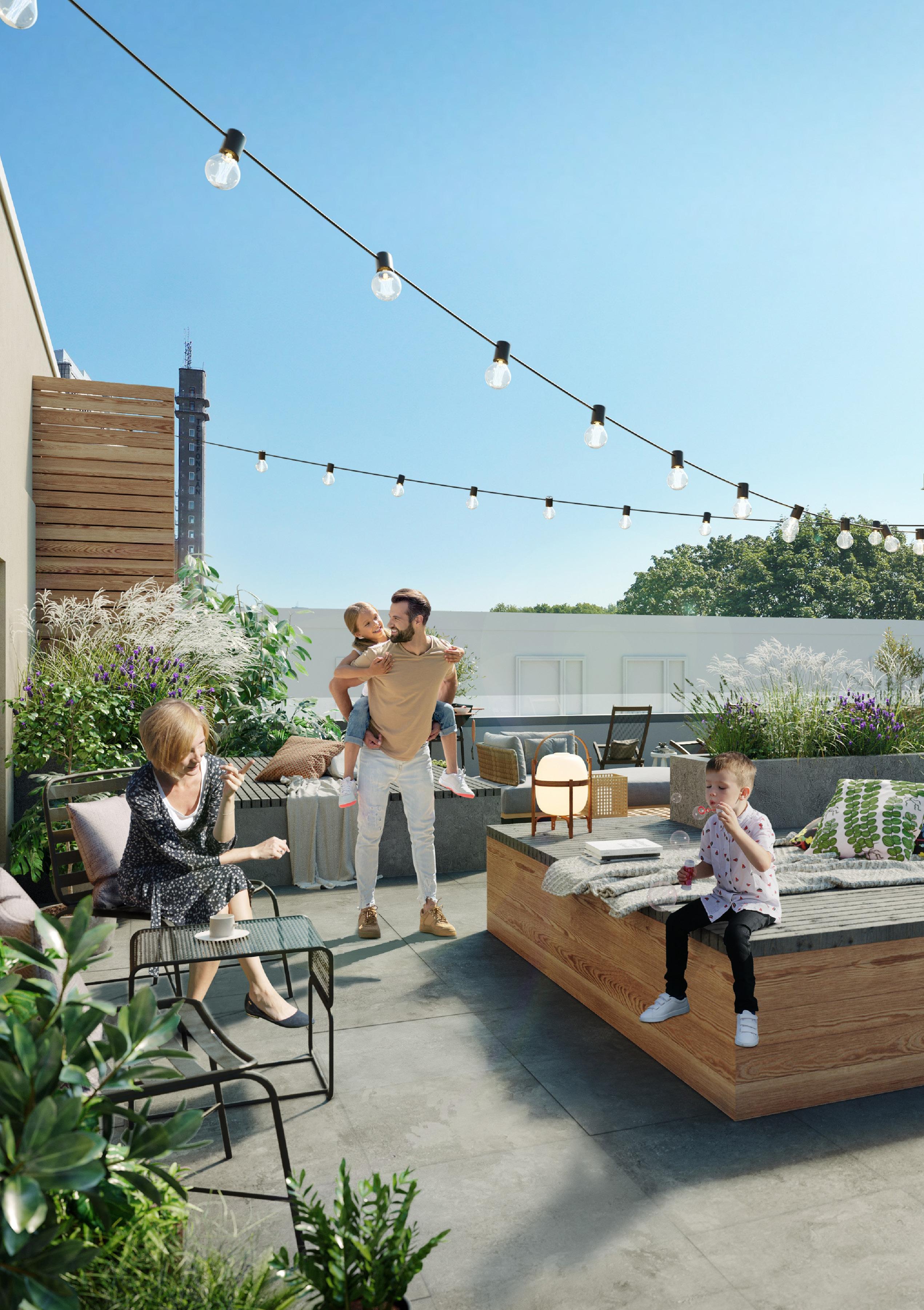 Tänk dig att barnen bara behöver gå ut genom entrédörren och in på gården för att vara på förskolan. Eller att det finns en kreativ ateljé som du kan boka för att ta nästa steg i din hobby eller ha ett kalas för alla vännerna. För att inte nämna den underbara takterrassen – redo för att ta emot minglande gäster till sommarens bjudningar.