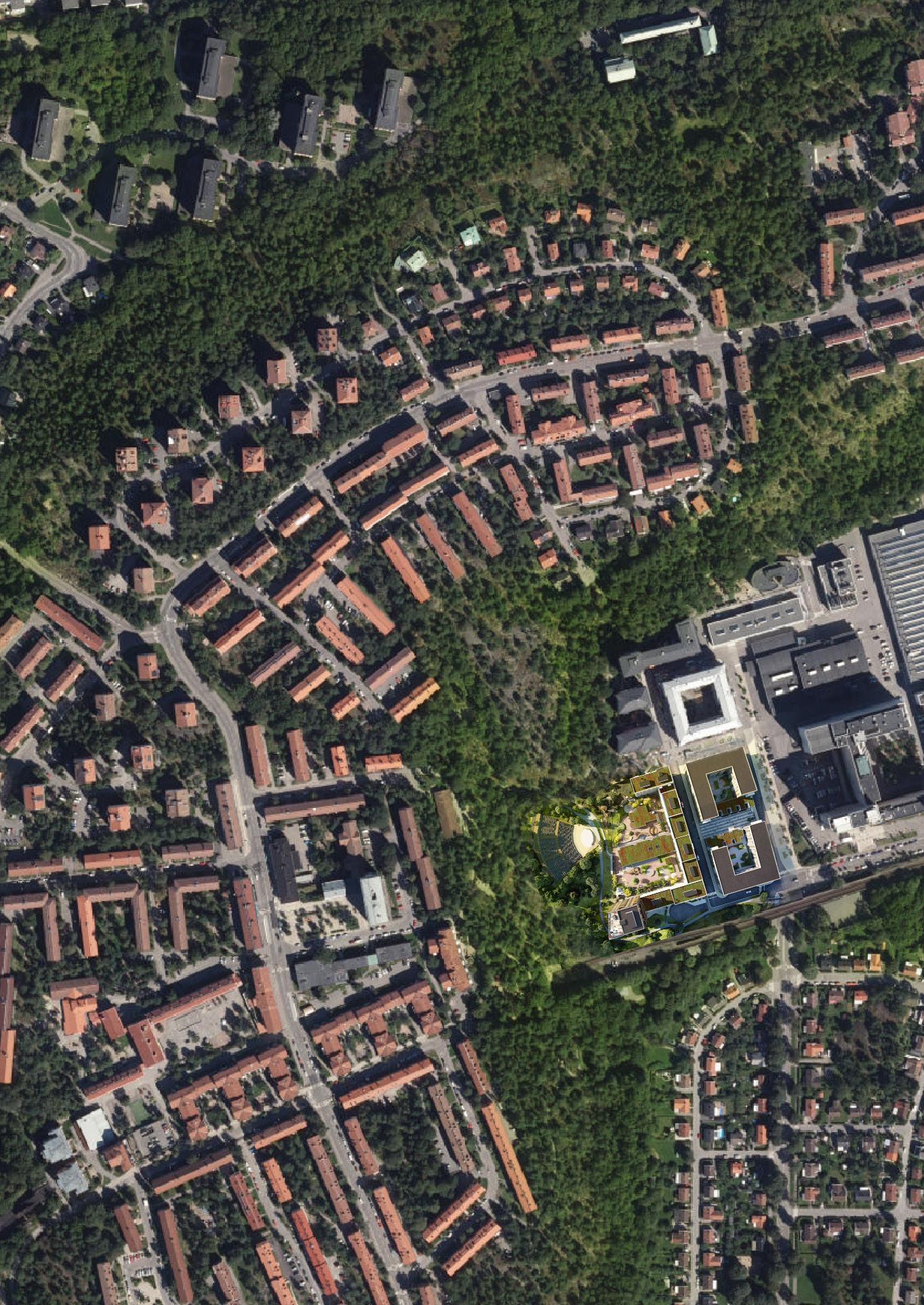 Översiktsbild av brf Växeln plus gråvolymer av Kvarter B med HSBs kommande projekt brf Diktafonen och brf Telefonkiosken