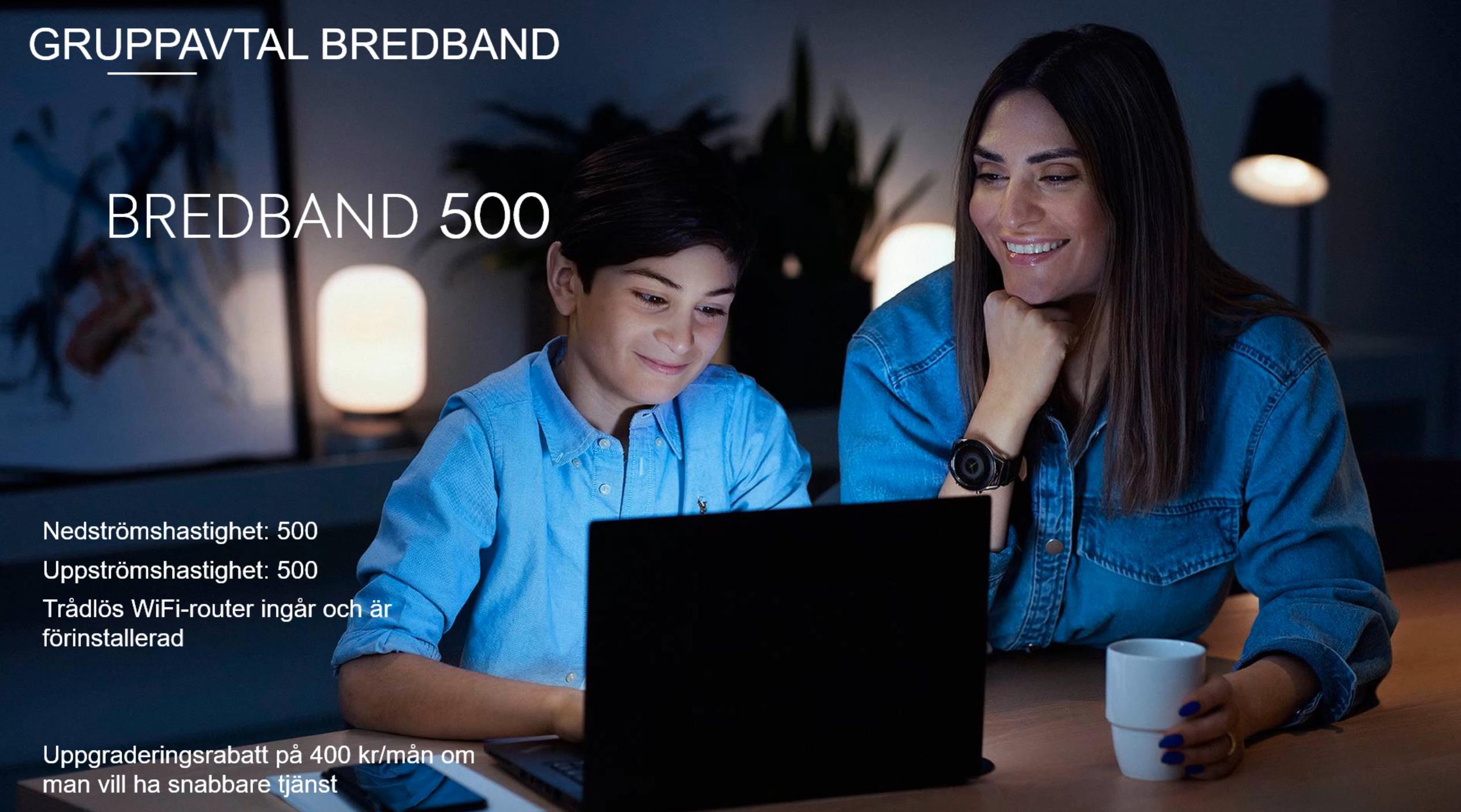 Bostadsrättsföreningen har tecknat ett gruppabonnemang med grundutbud för tv/ telefoni/bredband hos Tele 2. Anslutningen är obligatorisk för samtliga lägenheter i föreningen. Kostnaden debiteras per lgh med 271kr i månaden för bredband 500/500 + Telefoni + Tv BAS.