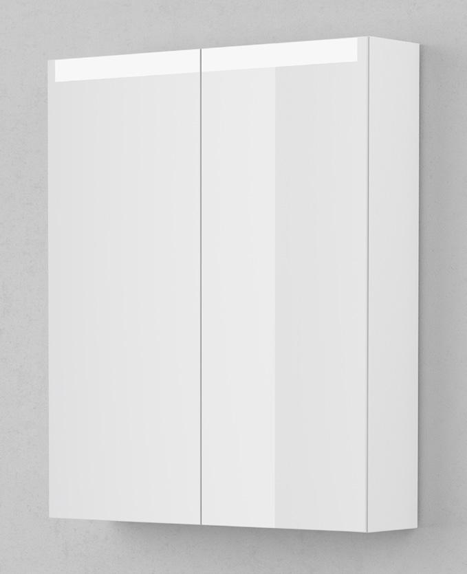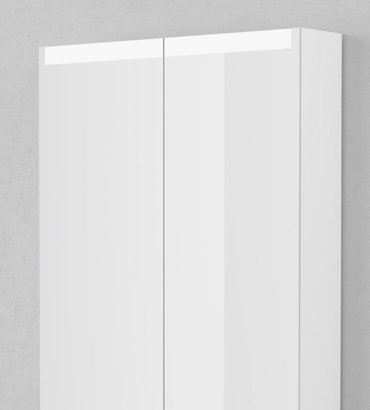 SPEGELSKÅP STAGE 60 MED OVANBELYSNING Glashyllor, LED-belysning, Prylhållarmagnet, Speglar även på insida av luckor, Eluttag. 4000 K Mått (BxHxD): 600x720x140 mm Premium White
