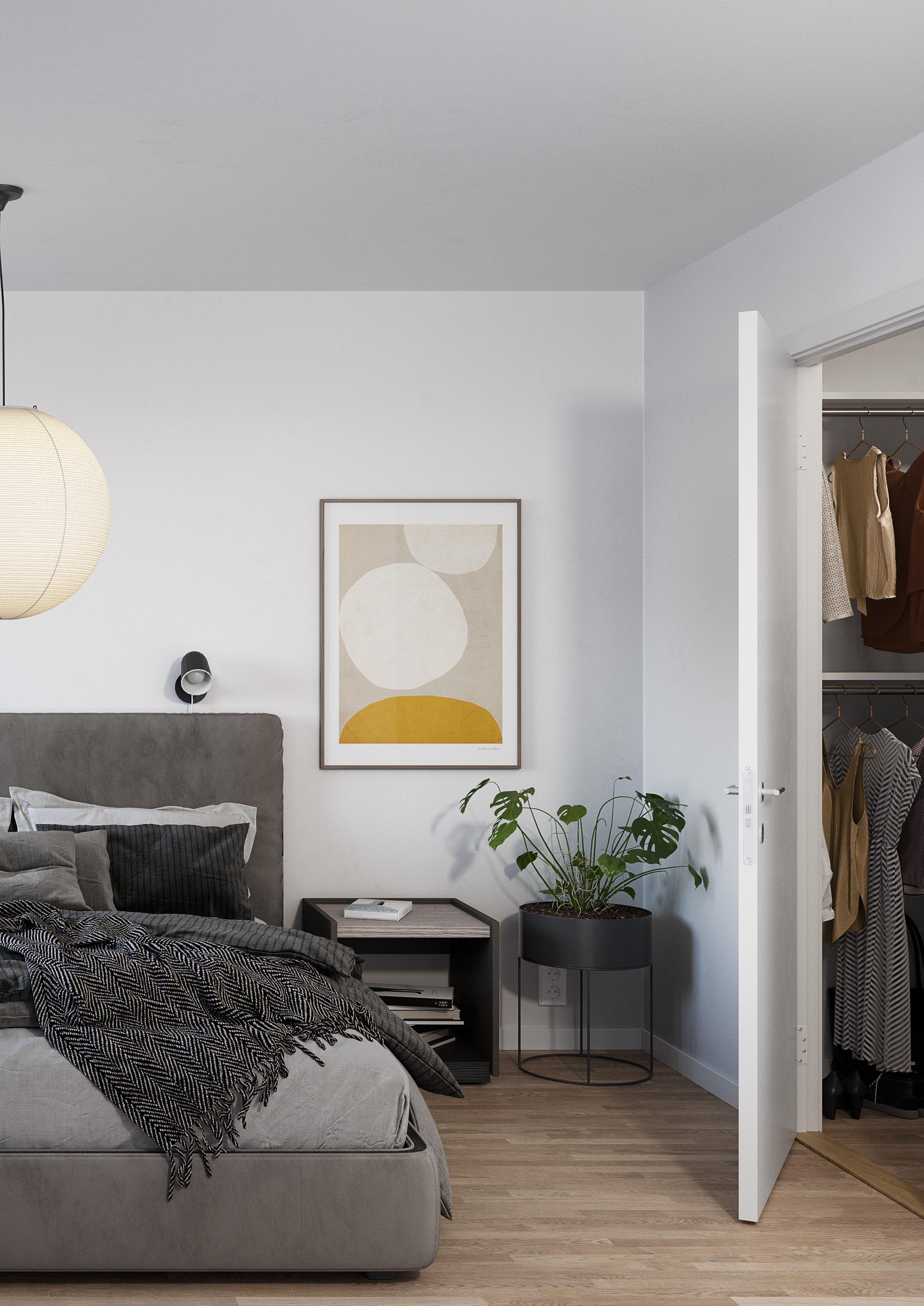 KONTROLLERA på lägenhetsritningen om det ingår skjut dörrsgarderob eller vanliga garderober i bostaden