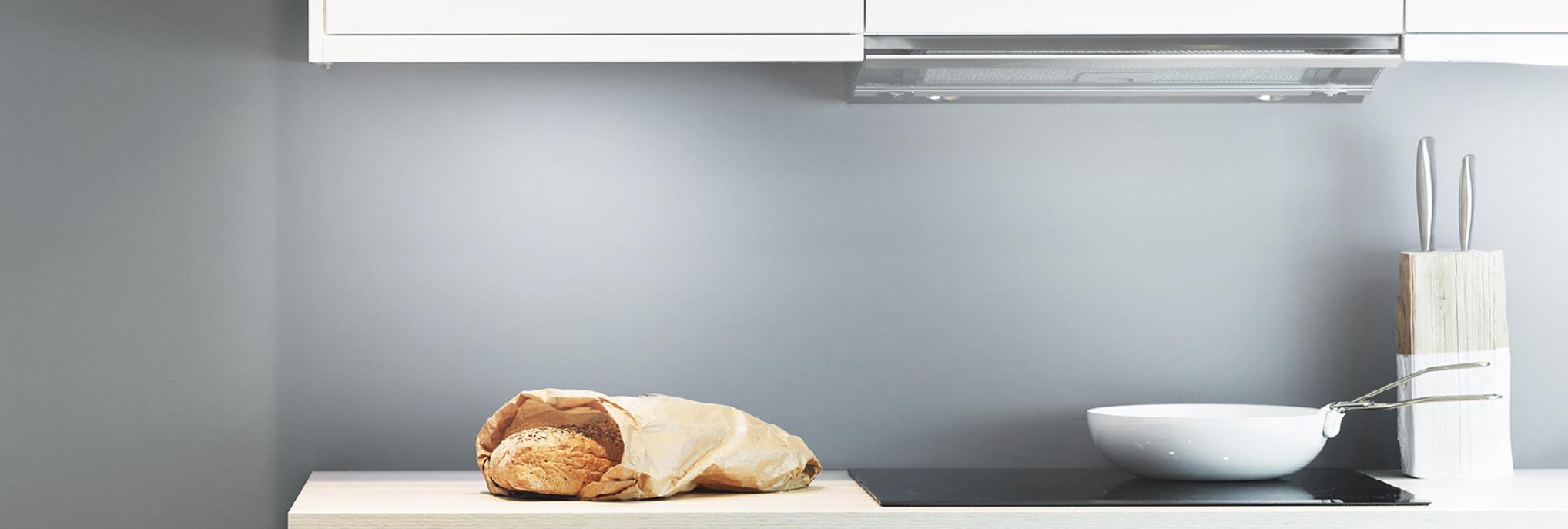 Helintegrerad spiskåpa, Vit, B 600 mm, med stor volymdel. Dolt montage bakom skåplucka som följer luckval för kök. Toppskåpet ovanför spiskåpan öppnas med push-öppning