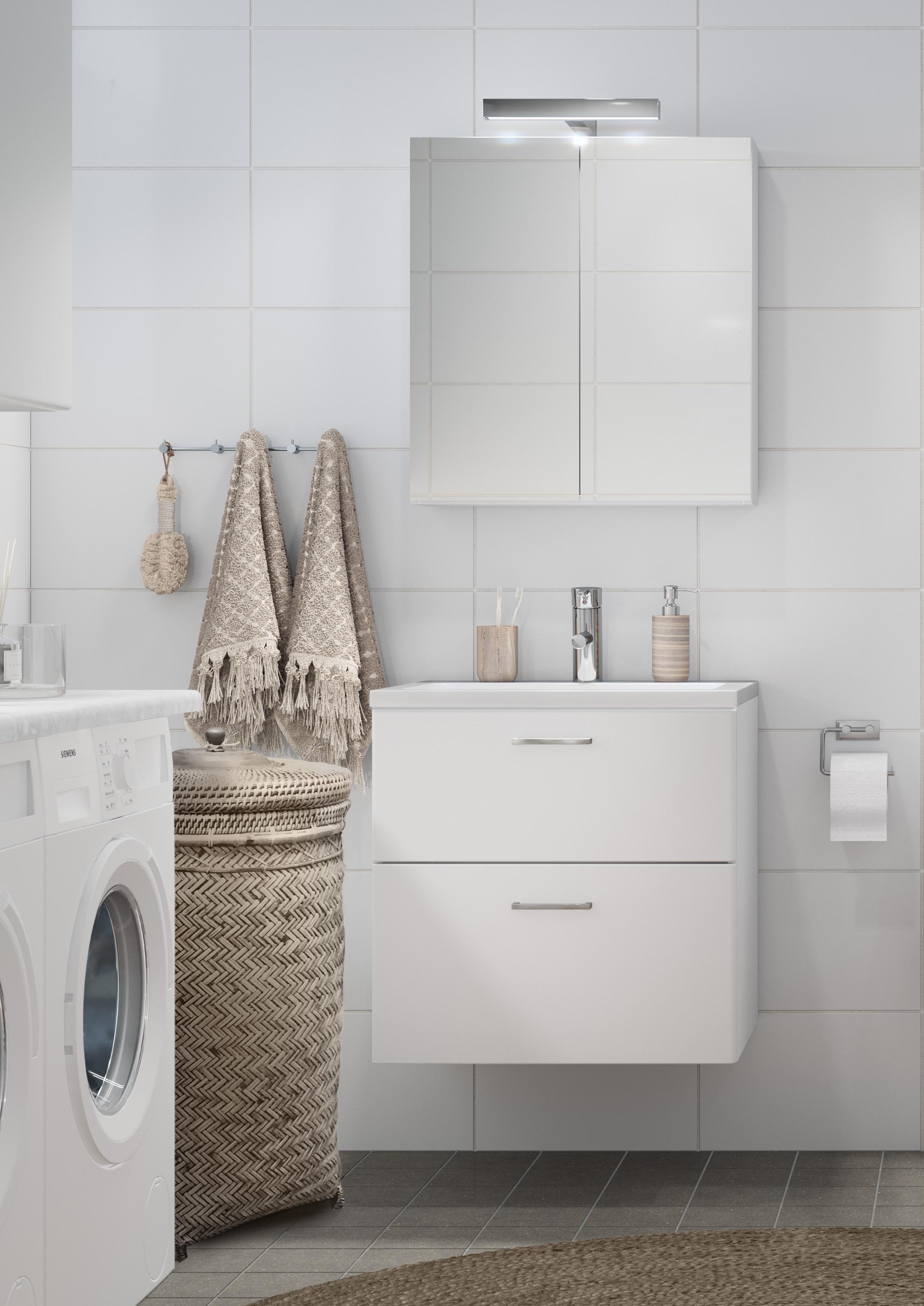 SPEGELSKÅP VIKEN 600 OCH KOMMOD FREE 615 Spegelskåp med dubbelsidiga dämpade spegelluckor, Glashyllor. Mått (BxHxD): 600x737x150 mm Vit