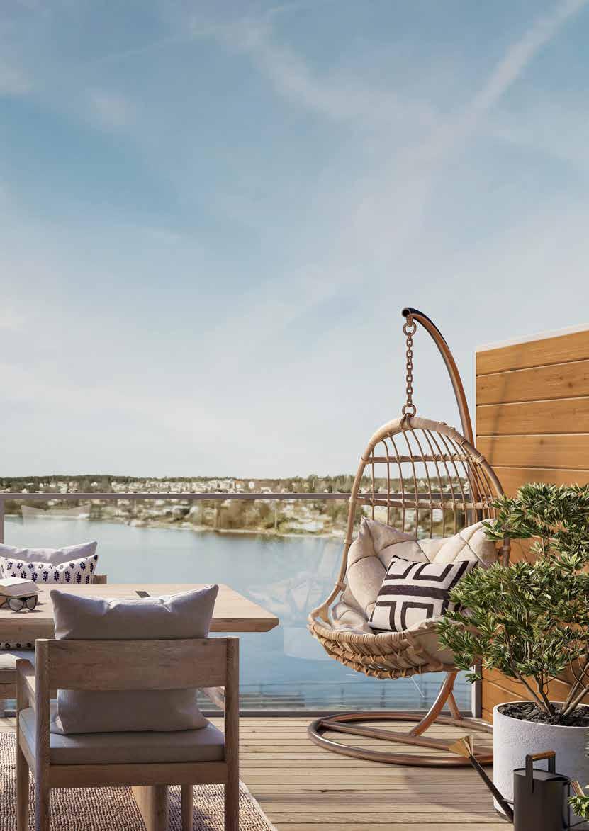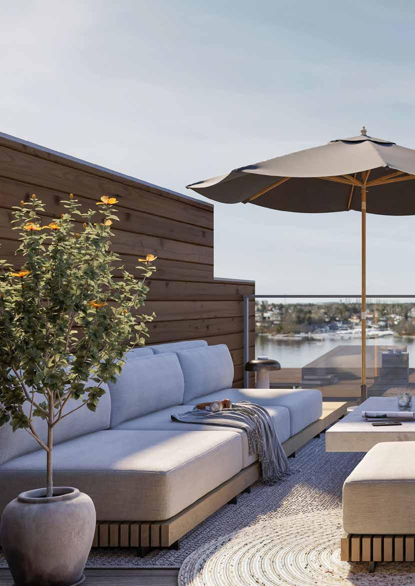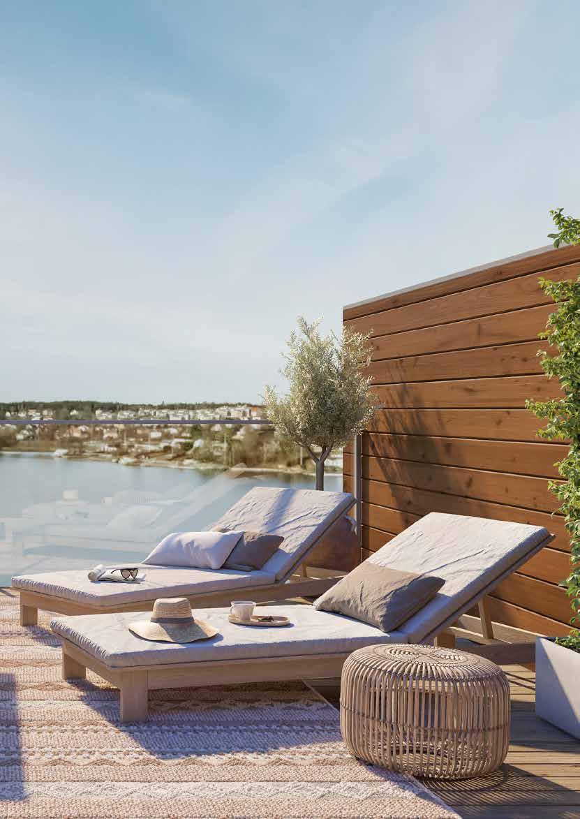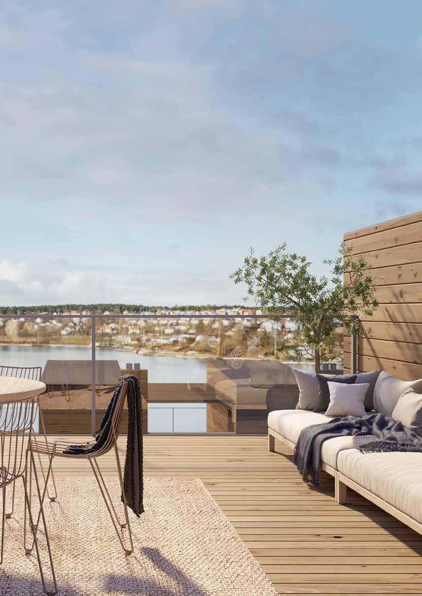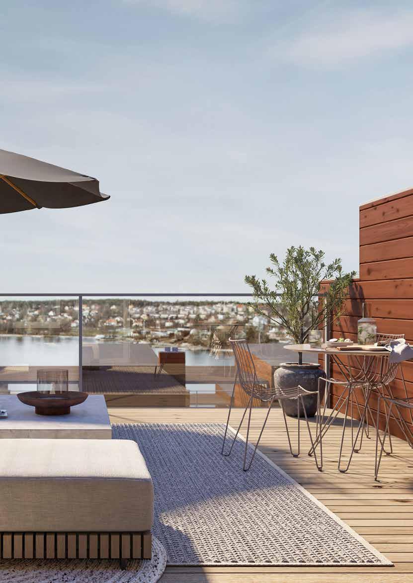 Radhusen är välplanerade, privata och har egna stora takterrasser med sagolik vy över vattnet. Ett noga utvalt inredningskoncept ingår i ostadens pris och är handplockat för att skapa ett exklusivt hem med hög standard. Utöver radhusens egna kvaliteter så ingår tillgång till garage, gym, relax, bastu och övernattningslägenhet.