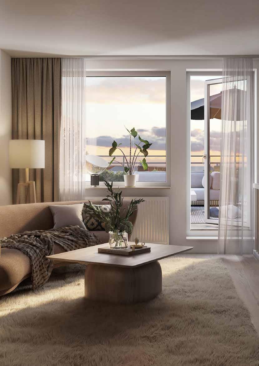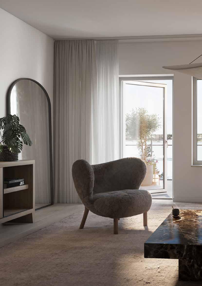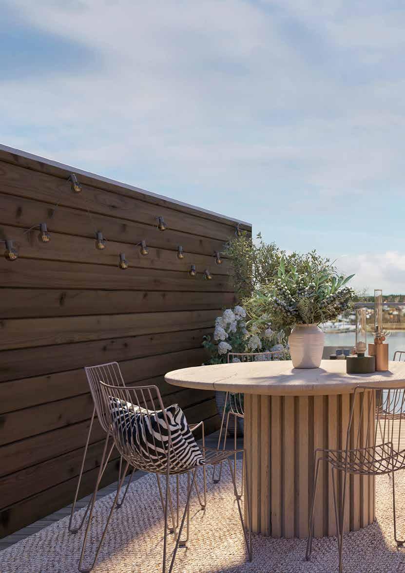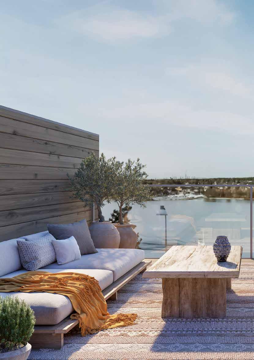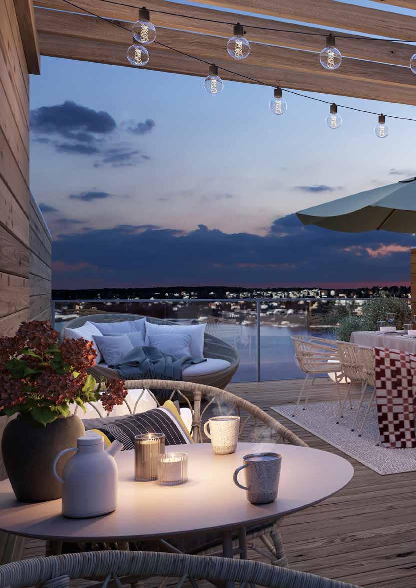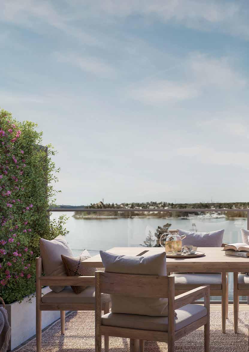 Radhusen är välplanerade, privata och har egna stora takterrasser med sagolik vy över vattnet. Ett noga utvalt inredningskoncept ingår i ostadens pris och är handplockat för att skapa ett exklusivt hem med hög standard. Utöver radhusens egna kvaliteter så ingår tillgång till garage, gym, relax, bastu och övernattningslägenhet.
