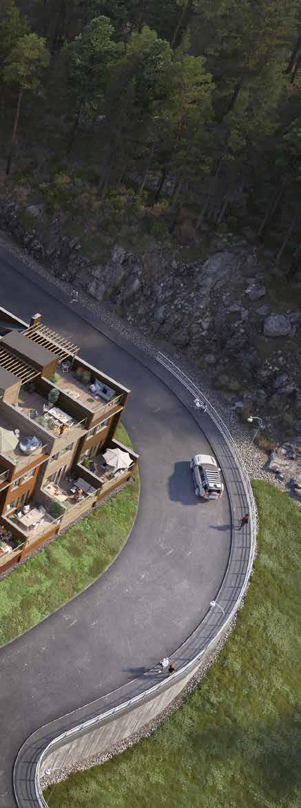 De 25 exklusiva radhusen ligger i en sluttning ner mot vattnet fördelade på tre rader. Varje rad har unika mervärden och olika utformning. Vi kallar dem Första parkett, Trygga mittraden och Toppraden. Toppraden är radhus i större storlek.