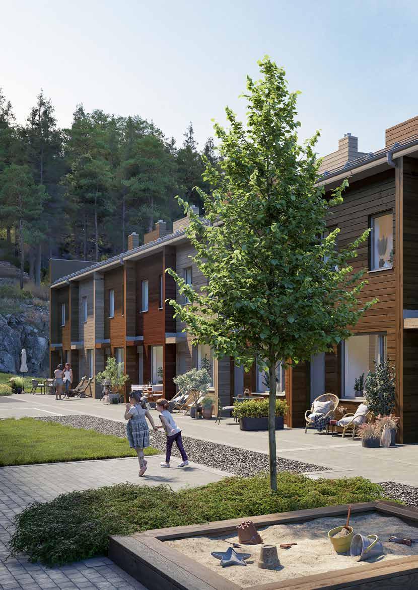 TRYGGA MITTRADEN består av 4-5 rok fördelade på 134 kvm. Gavelradhusen är om 5 rok och övriga 4 rok. På bottenvåningen finns det rymliga köket med extra förvaring och det välplanerade vardagsrummet. Utöver en välkomnande hall med förvaring finns även WC/dusch på våningsplanet. Radhusets entré vätter mot en gård med grönytor. Där finns även radhusets privata uteplats om ca 10 kvm. Trygga mittraden har en enkel access över gården till förråd, cykelrum och barnvagnsrum. En trappa upp hittar du samtliga tre sovrum, ett allrum, en klädkammare och familjebadrummet. Takterrassen om hela 38 kvm har en vidunderlig utsikt över vattnet. Den är spatiös, privat och har dessutom en platsbyggd pergola. Takterrassen är förberedd för utekök.