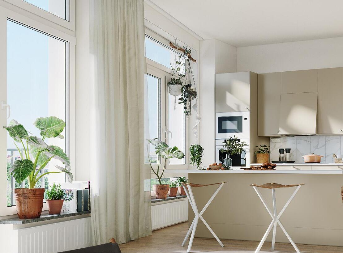 Vakna upp till ljus som flödar in från de stora fönsterna. Doften av nytt blandas med doften av nybryggt kaffe. Förbered din frukost på den härliga köksön. Ljudet av kaffekoppens porslin som möter den exklusiva bänkskivans kompositsten. Njut av morgonen på balkongen och blicka ut över Stockholm. Inga grannar som har insyn, bara ett par fåglar som flyger förbi. Livet i en splitterny bostadsrätt i brf Växelns toppvåningar. Lite extra guldkant på tillvaron.