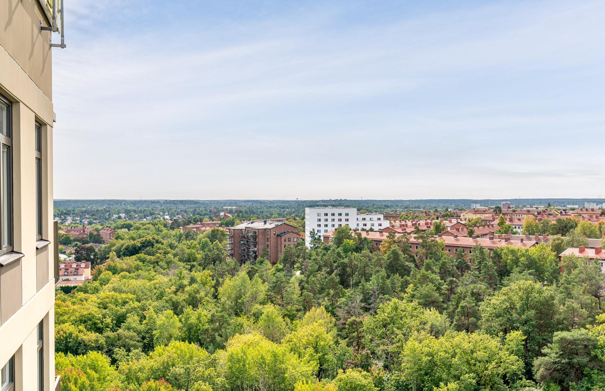 Välkommen till en av husets bästa tvåor, belägen på 15:e våningen med unik utsikt över Stockholm. Lägenheten får en generös takhöjd på 3,10 meter och extra stora fönster som förstärker utsikten i två väderstreck. I anslutning till vardagsrum finns en fantastisk balkong mot väst, där magiska solnedgångar över staden utlovas.