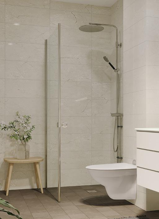 WC/dusch går i samma färg och stil men har istället för badkar, klarglasade duschväggar och en stilfull takdusch.