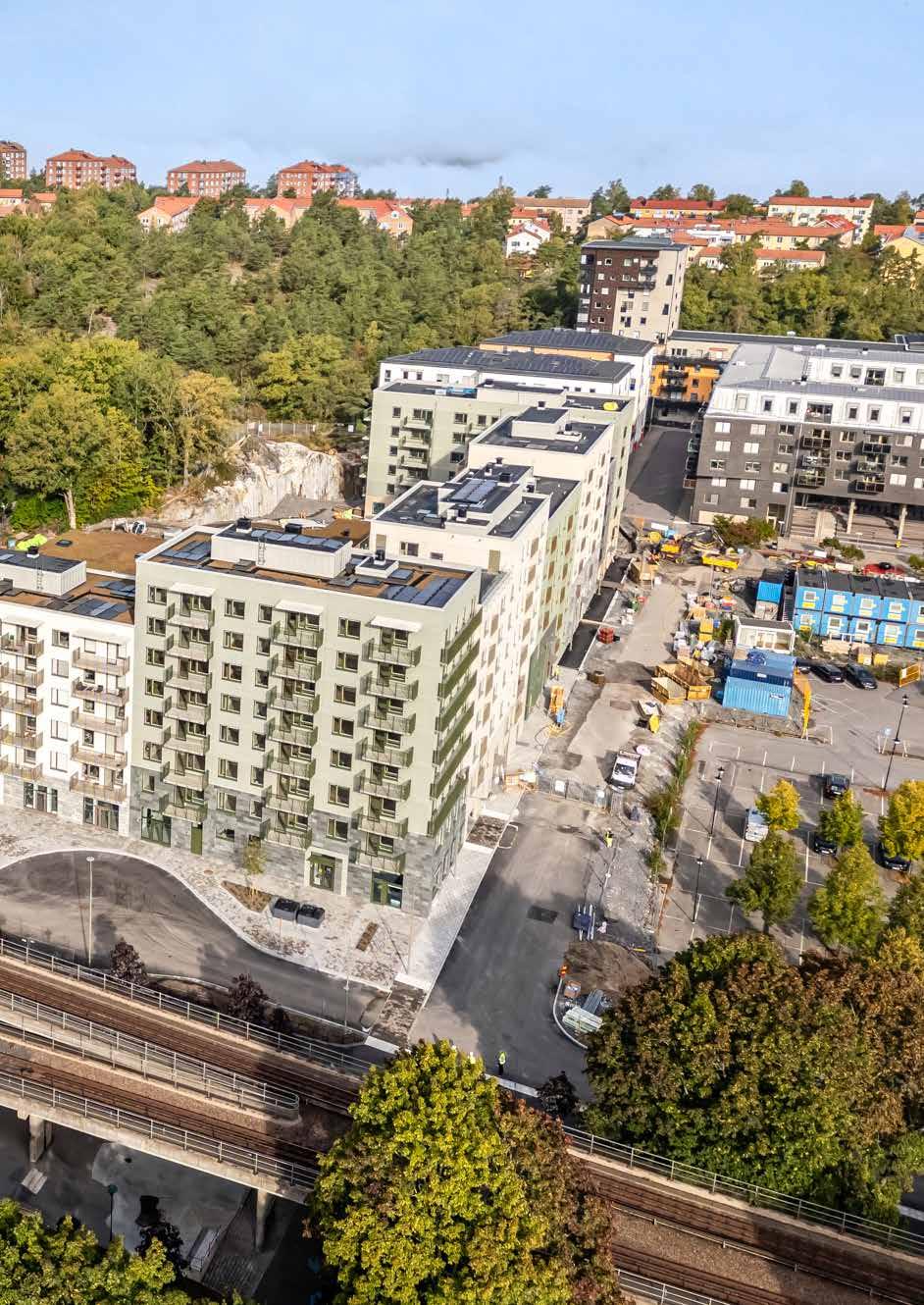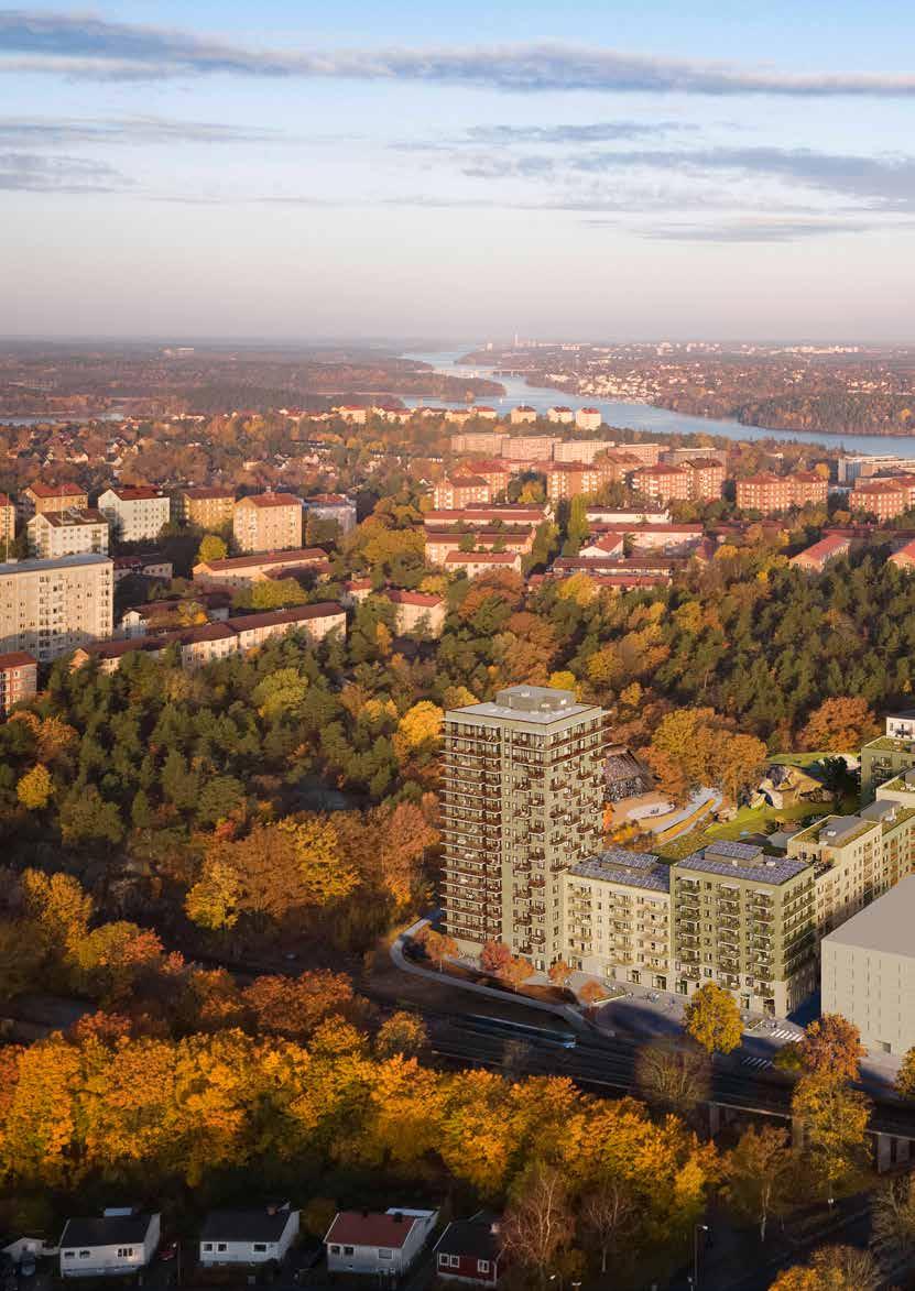 Interiört har toppvåningarna en hög inredningsstandard och från de rymliga balkongerna kan man njuta av en fantastisk utsikt över Stockholm.