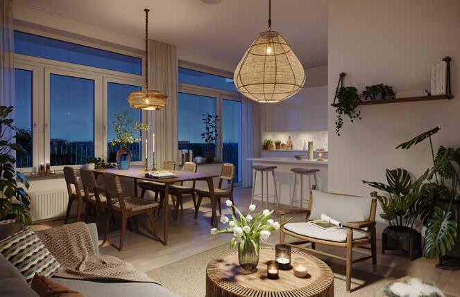 I motsatt del av bostaden breder de sociala ytorna ut sig, perfekta för både middagar och avkoppling. Här möts du av en öppen och rymlig miljö som bjuder in till umgänge och trivsel.