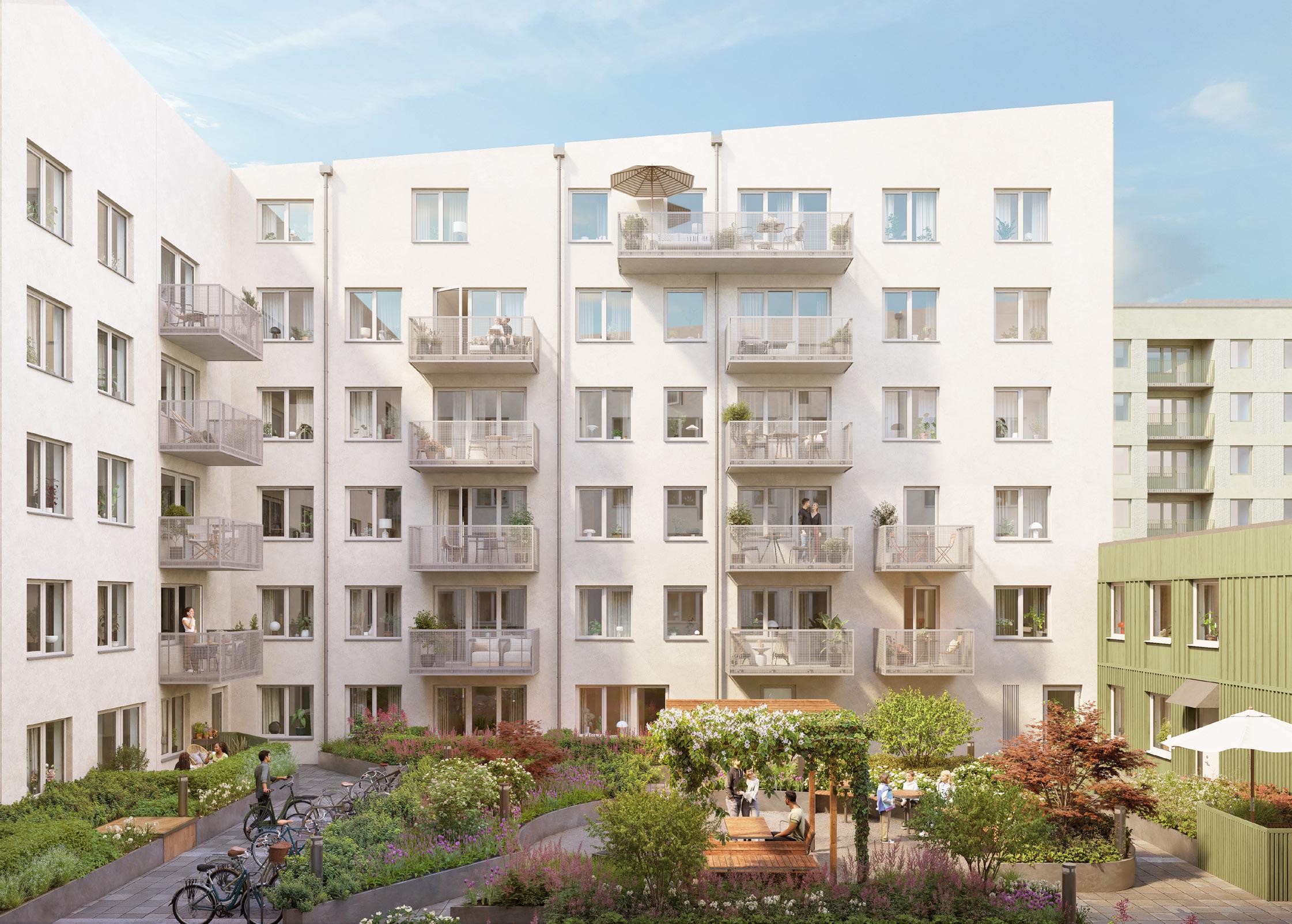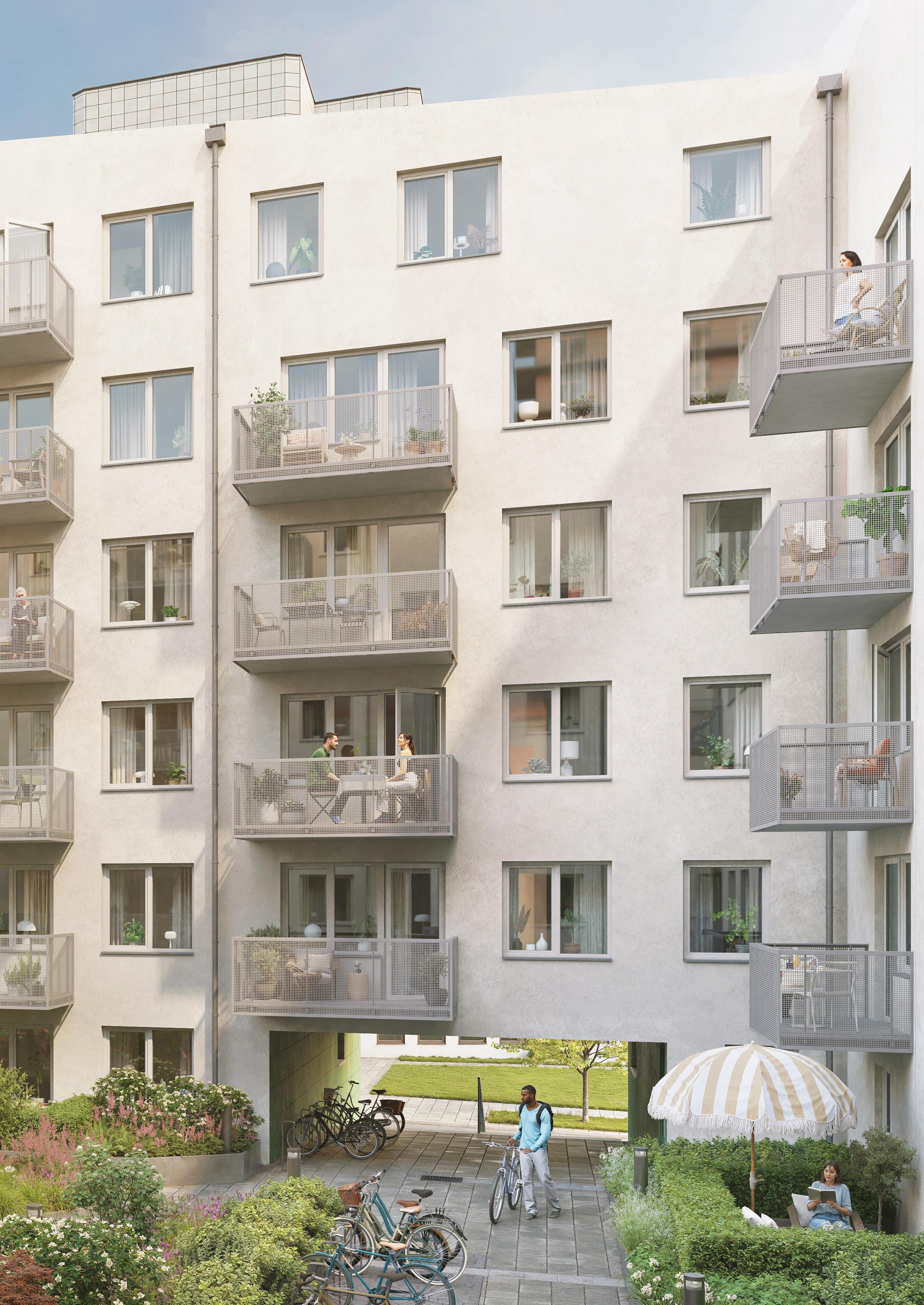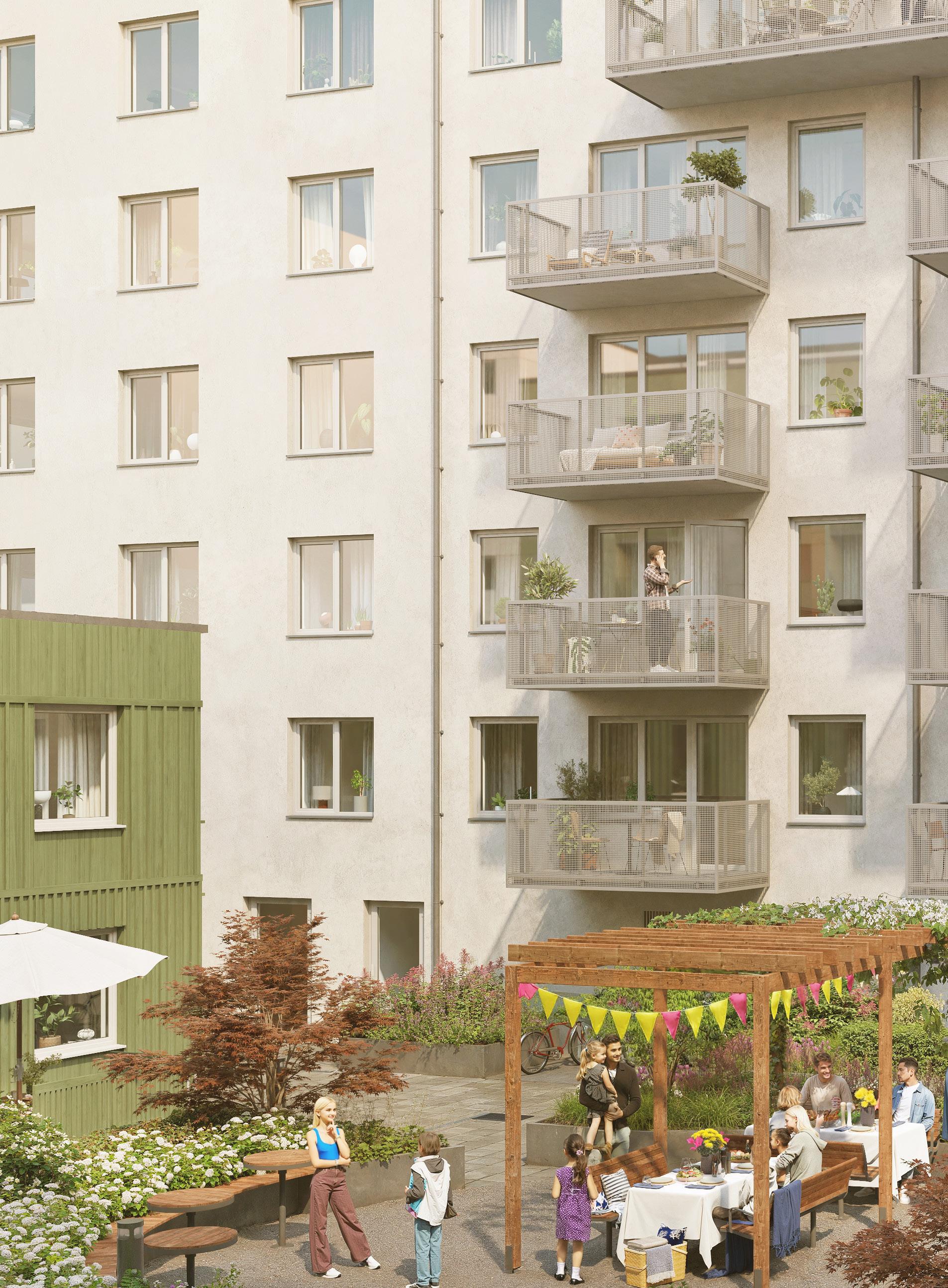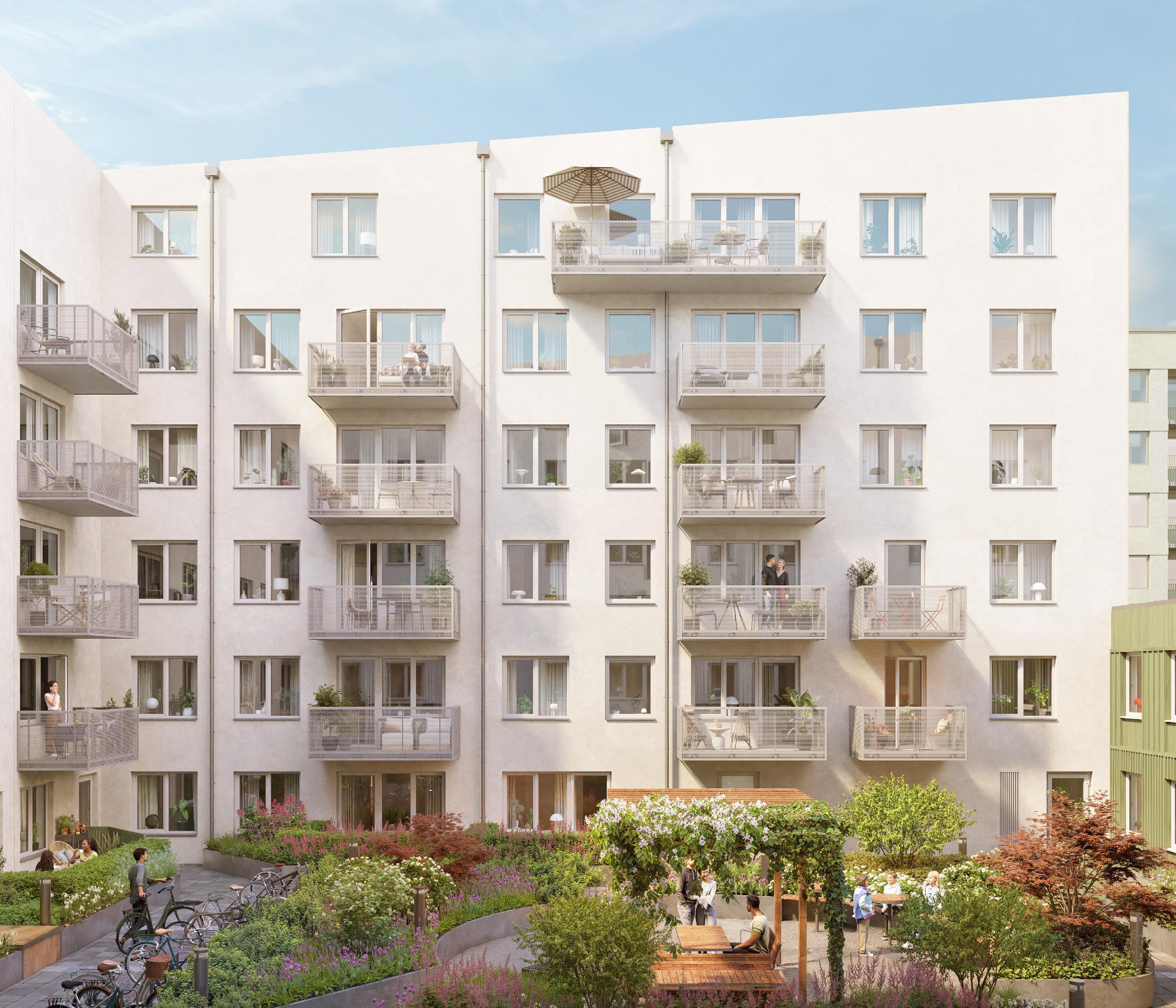 Bostäderna varierar i storlek och form – från yteffektiva ettor till rymliga flerfamiljslägenheter och stadsradhus med egen entré. Gården är trygg, inbjudande och grön, och ramas in av den småskaliga kvartersgatan där stadsmiljö möter en mer intim, nästan lantlig känsla.