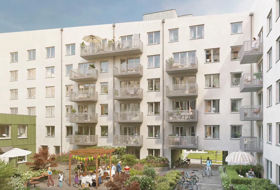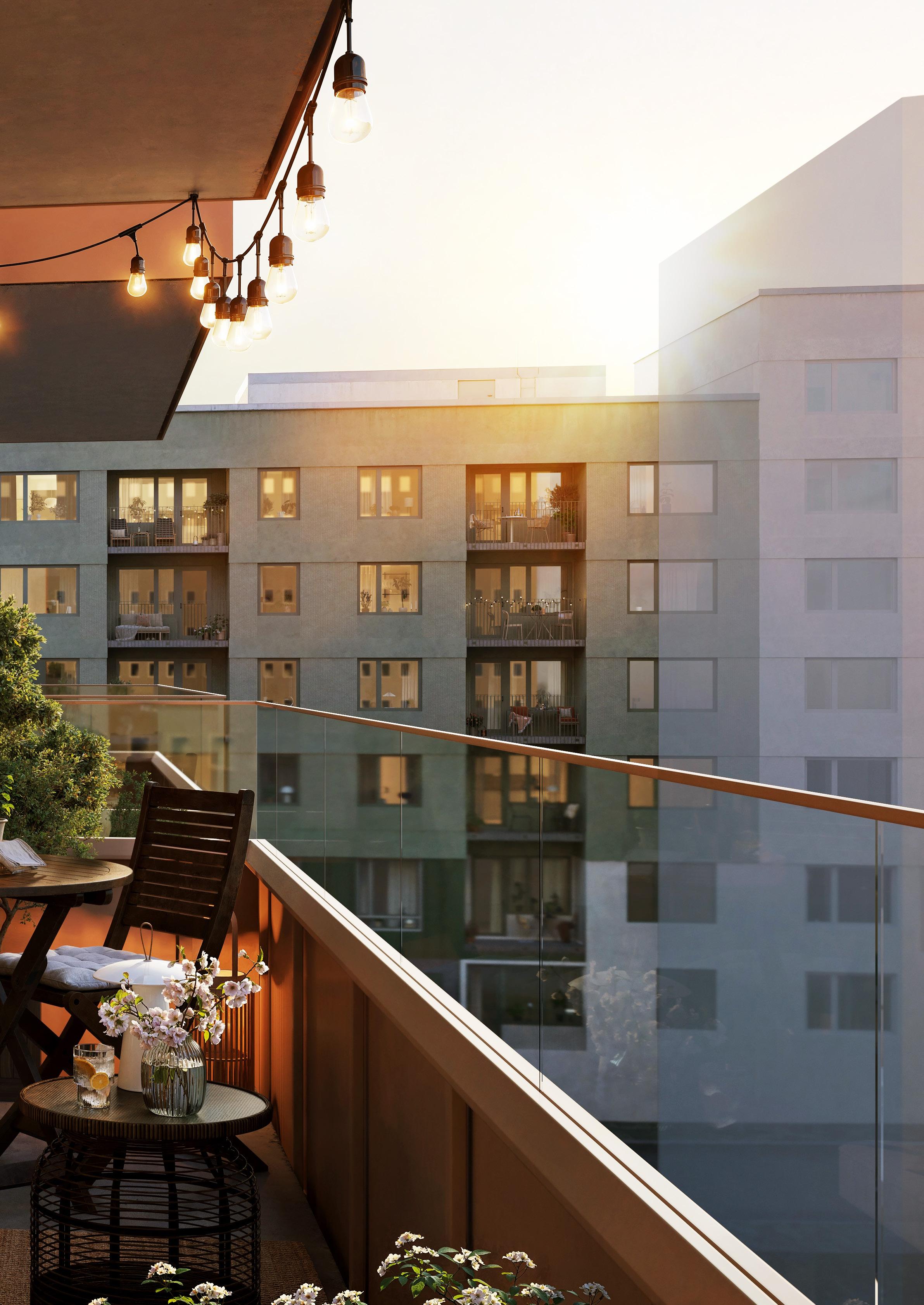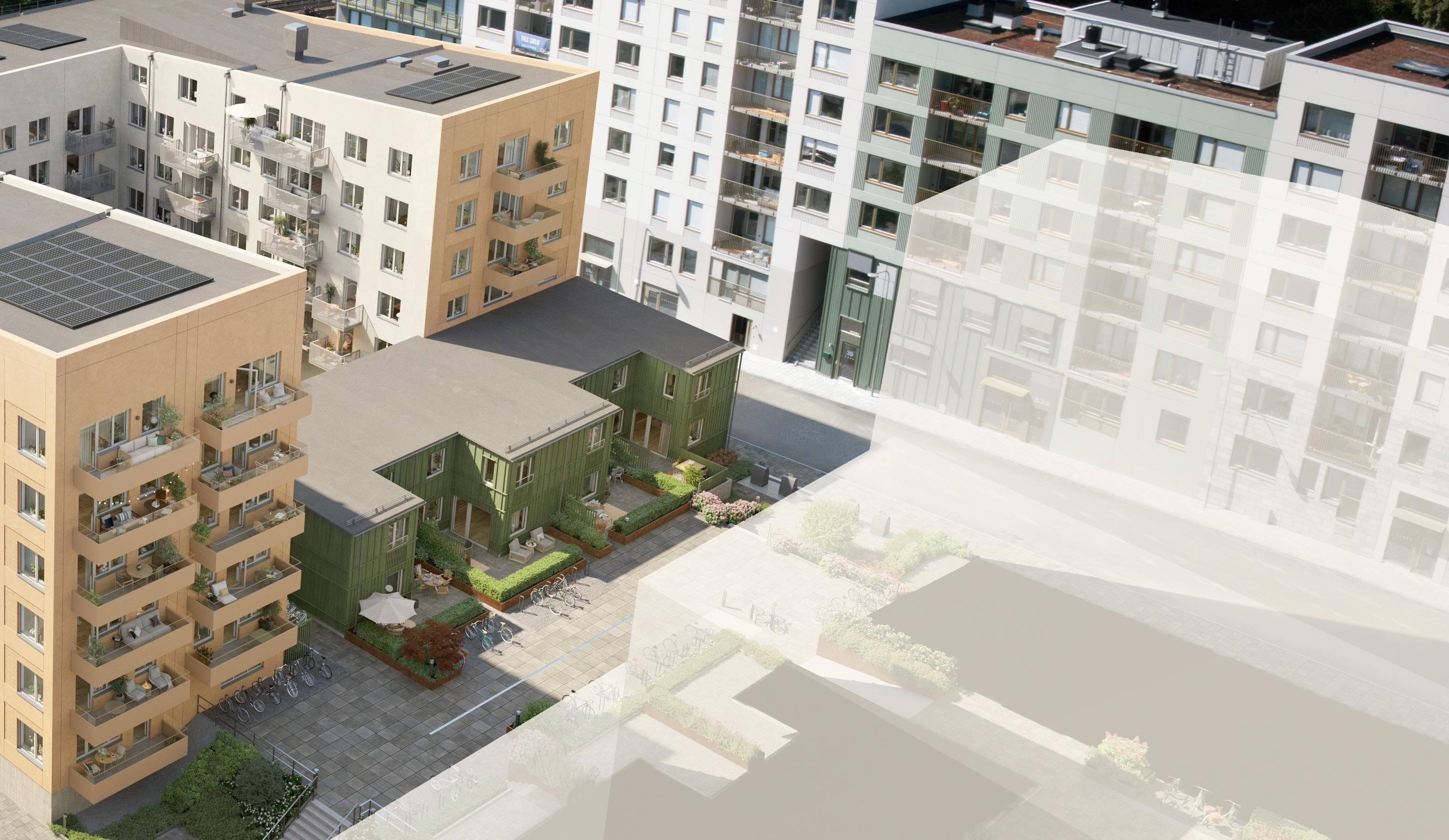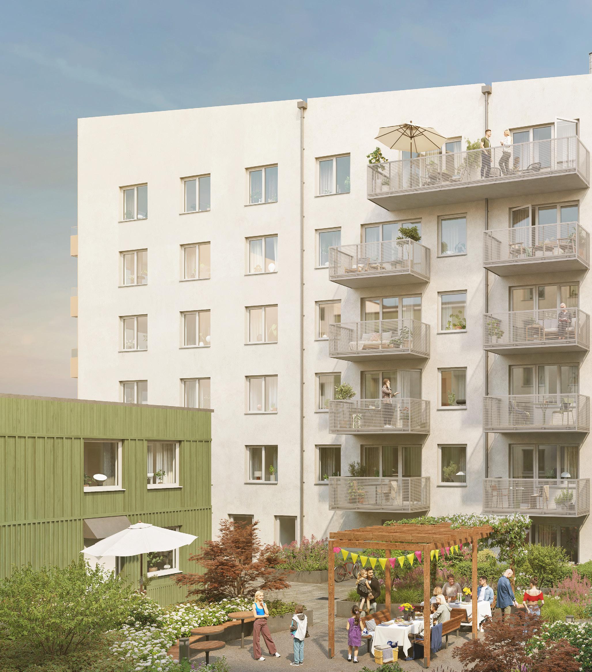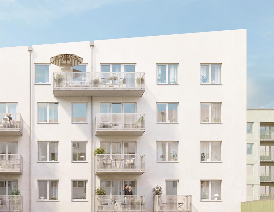 Bostäderna varierar i storlek och form – från yteffektiva ettor till rymliga flerfamiljslägenheter och stadsradhus med egen entré. Gården är trygg, inbjudande och grön, och ramas in av den småskaliga kvartersgatan där stadsmiljö möter en mer intim, nästan lantlig känsla.