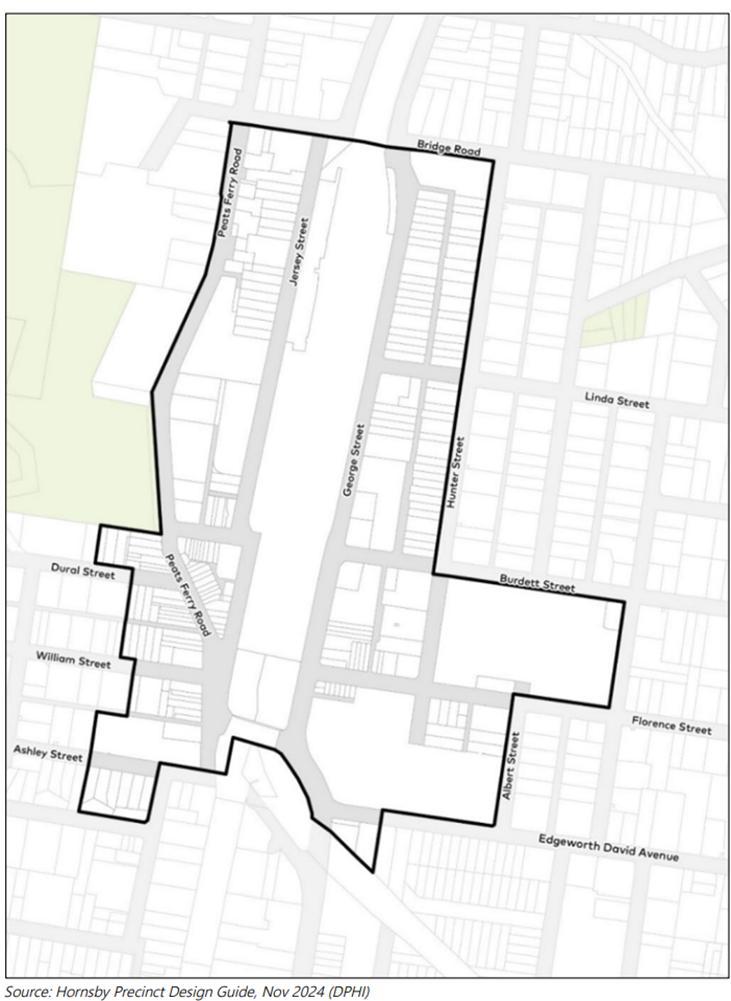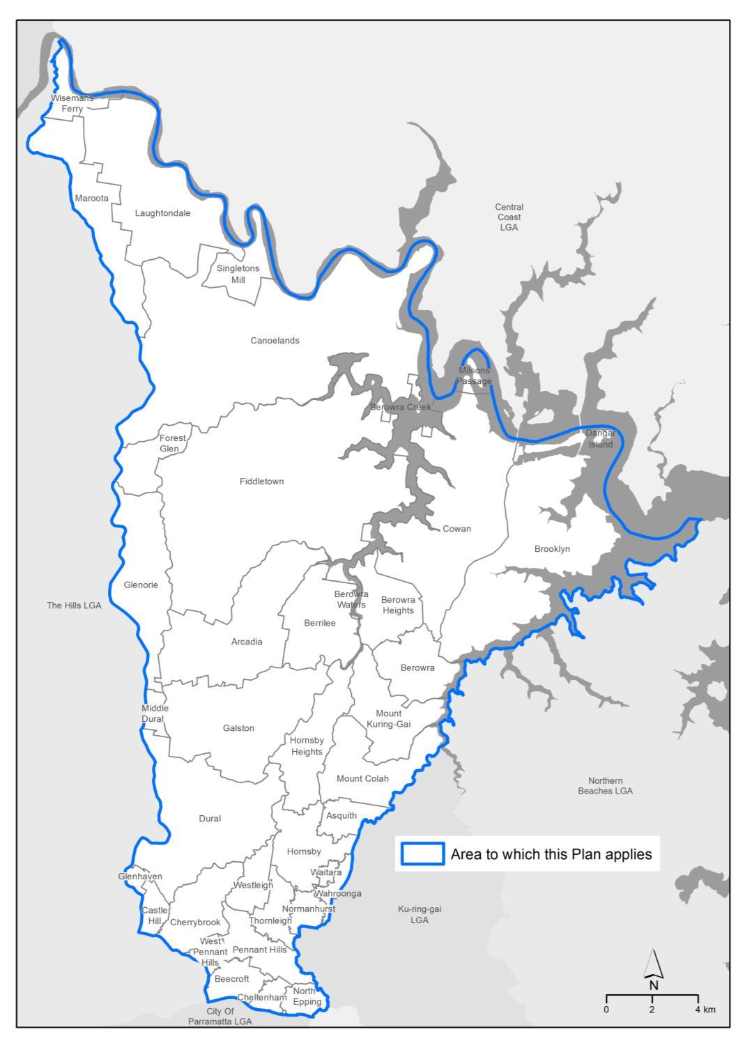 This Plan applies to all land within the local government area (LGA) of Hornsby Shire Council as shown on the Map (see Figure 1), excluding the Hornsby Town Centre Precinct as depicted on the Map (see Figure 2).