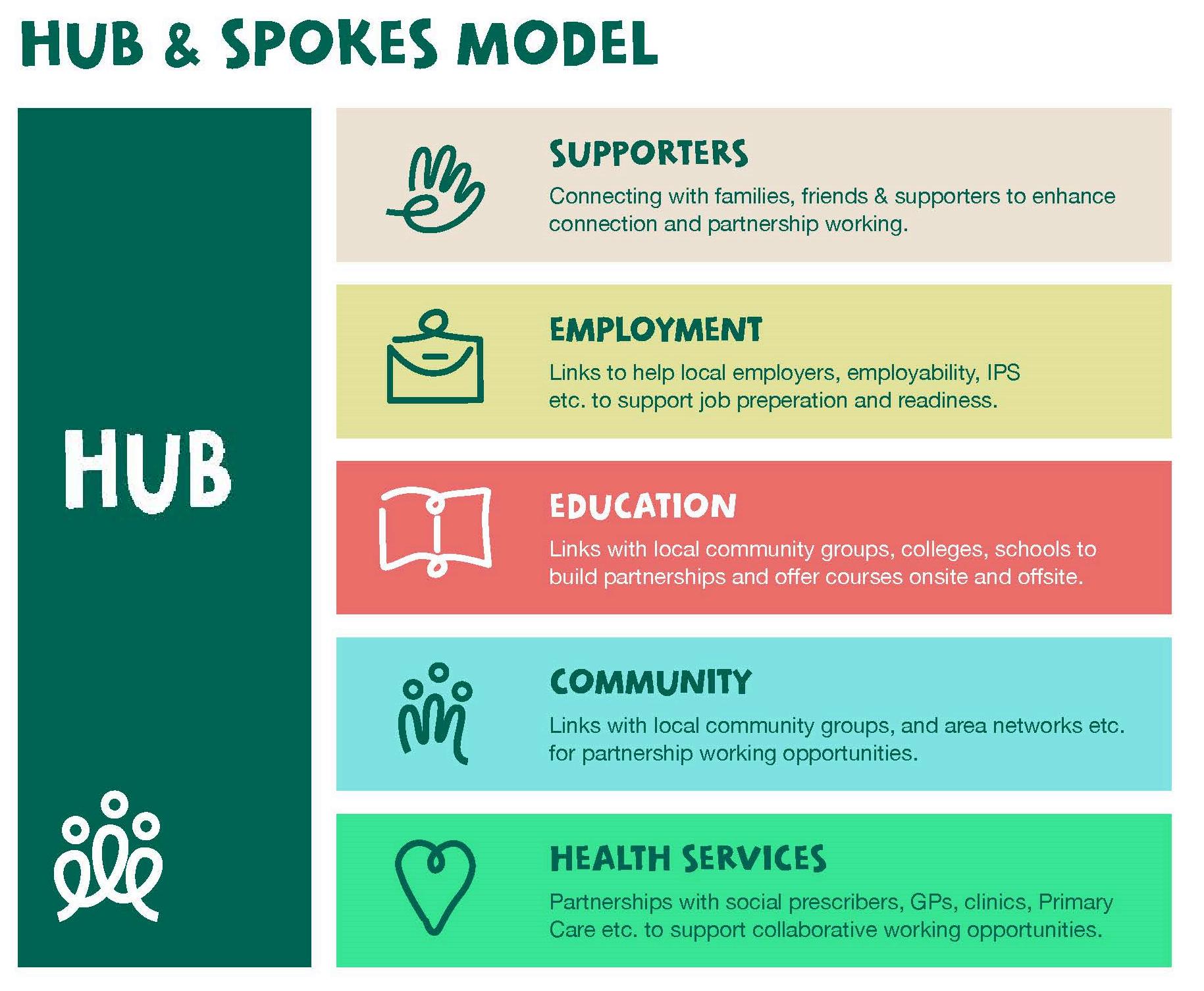 The programme will operate using a HUB and Spokes model in which the centre will act as a hub to form active and dynamic relationships (spokes) with different community-based services and resources, as depicted below.
