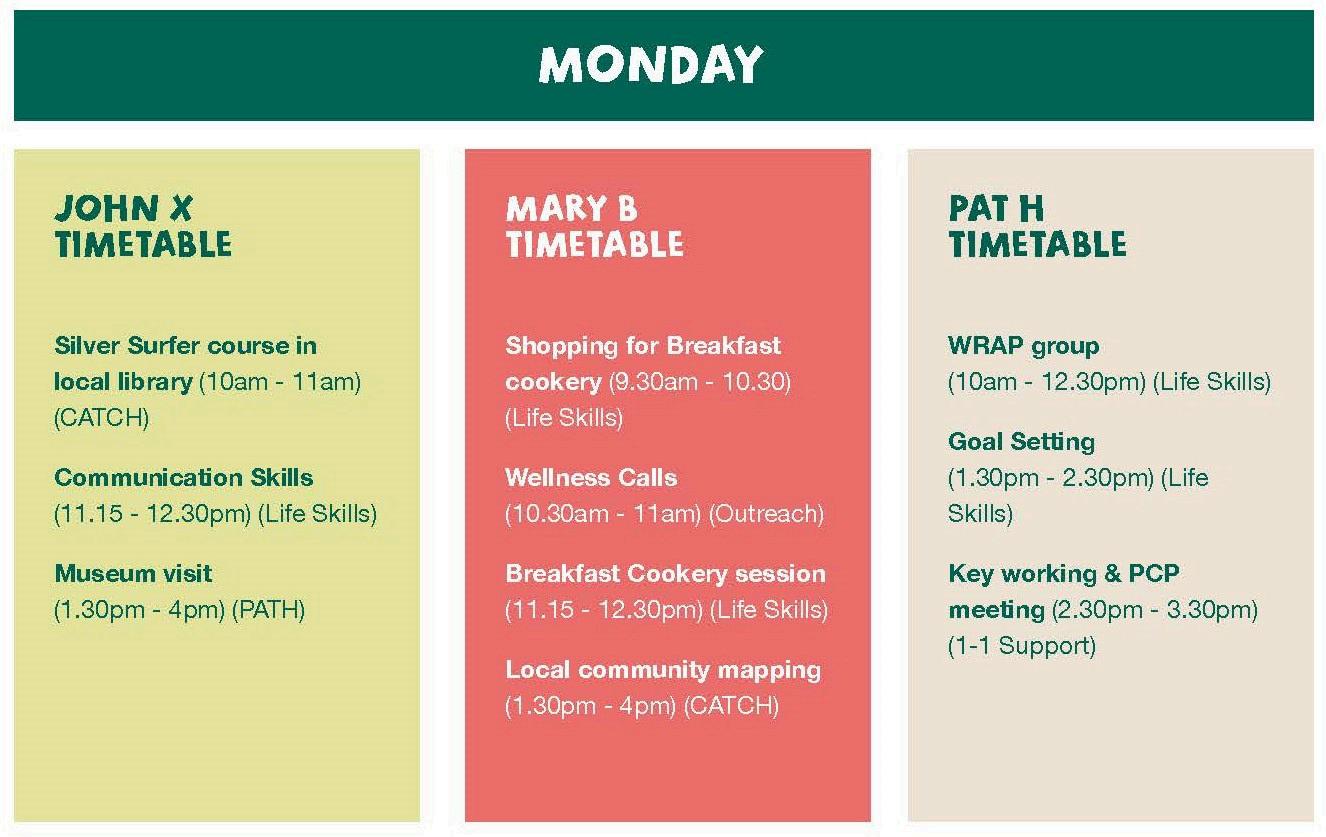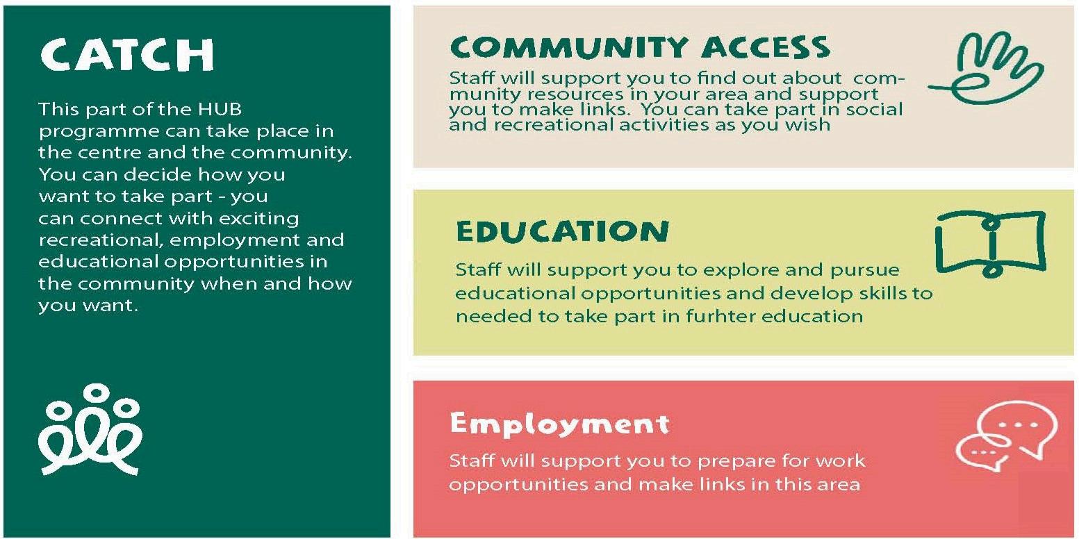 There will be several activities available based on a timetable. Each participant will access activities as per their individual timetable These activities can be derived from the individuals’ goals as set in their PCP. External activities (via the CATCH module) will be facilitated alongside individualised key worker meetings, and a selection of centre/alternative HUB-based activities are offered for those who are not engaged externally.