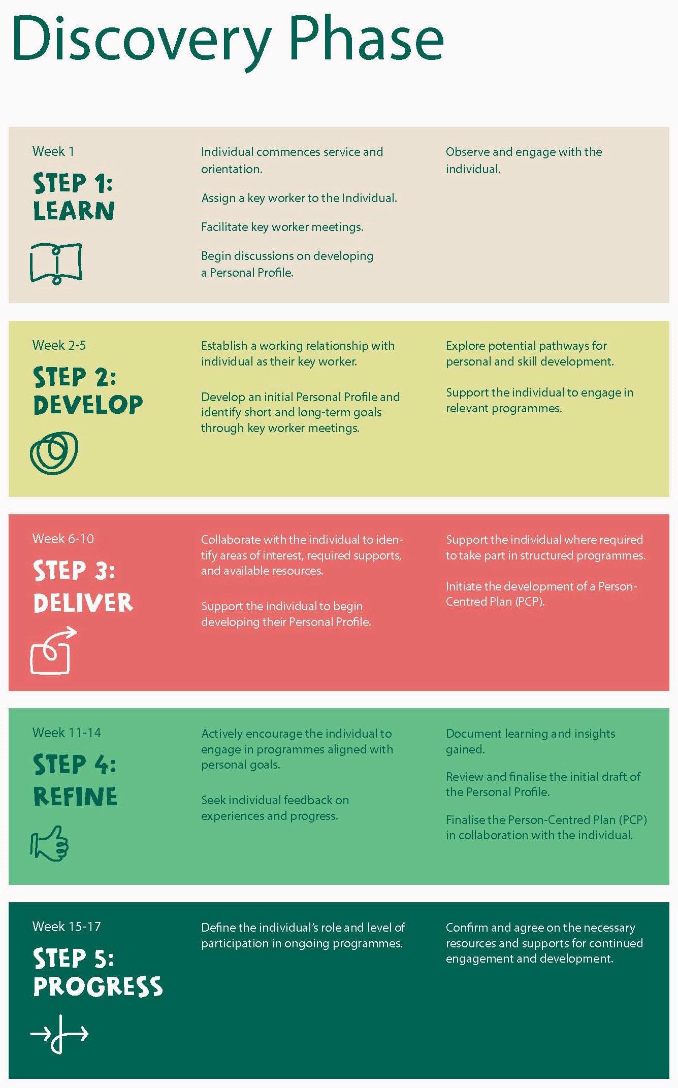 Discovery - An individual will start the programme & work through a Discovery Phase where the individual and staff get to know one another A staff member is assigned as a participants’ key worker. This key worker will then support the individual to develop their initial Personal Profile. This in turn will support the individual to develop their first PersonCentred Plan (PCP).
