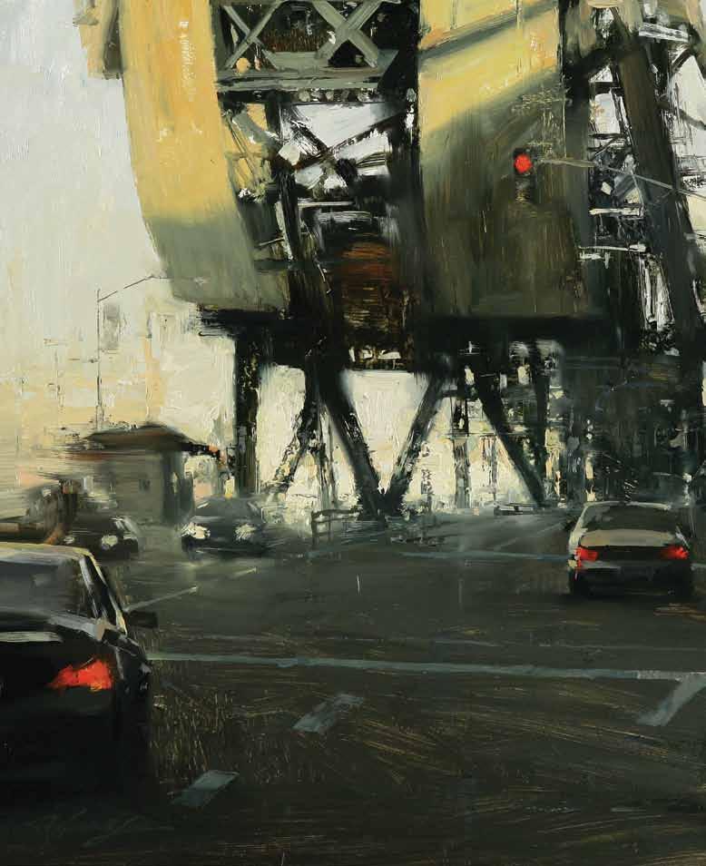 left: “ Painting alla prima with brushes and palette knives,” says Tseng, “I played with the texture of both the paint and the architectural elements in The Bridge (oil, 16x16).”
