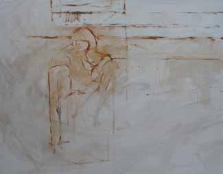 noticeable when you compare the image in the previous step with the image in the next one. Moving forward, I continued working the form and anatomy of the figures while focusing on the soft-hard, lost-and-found qualities of the edges. I kept in mind that, because the light (coming from the ceiling window) was cool, I would make the shadows warm. Also, I kept my shadows transparent to emphasize the thin-to-thick approach.