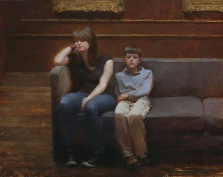 At the National Gallery of Art in Washington, D.C., I noticed a young boy and a teenage girl sitting next to each other. They were obviously bored, despite being surrounded by Rembrandt’s paintings—restless kids waiting for their parents to finish viewing the art. I took many photos and then, back at the studio, began a series of pencil sketches consisting of simple abstract shapes executed as two-value studies. I looked for big shapes, rhythmic movement and good composition. This demonstration shows only one of many ways to approach a painting. To me, there are no limits to the possibilities.