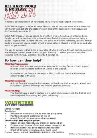 ALL HARD WORK & NO PLAY? A flexible, adaptable team of volunteers who provide direct support to scouting. Scout Active Support - we’ve all heard about it! We all think we know what it does! So why haven’t we got lots of people involved! One of the reasons may be because we don’t actively recruit for it? Scout Active Support allows people to give their time to Scouting on a flexible basis. People can still be involved in Scouting without the full-time commitment of being a leader. Anyone over 18 years can join, this could be Network members, leaders, former leaders, parents of young people or just anyone with an interest in what we do and who wants to get involved. The key to success is that it has a clear idea of what it is there for and that its members are willing to commit some time to support Scouting. It should provide a valuable resource to the Group, District or County it belongs to.