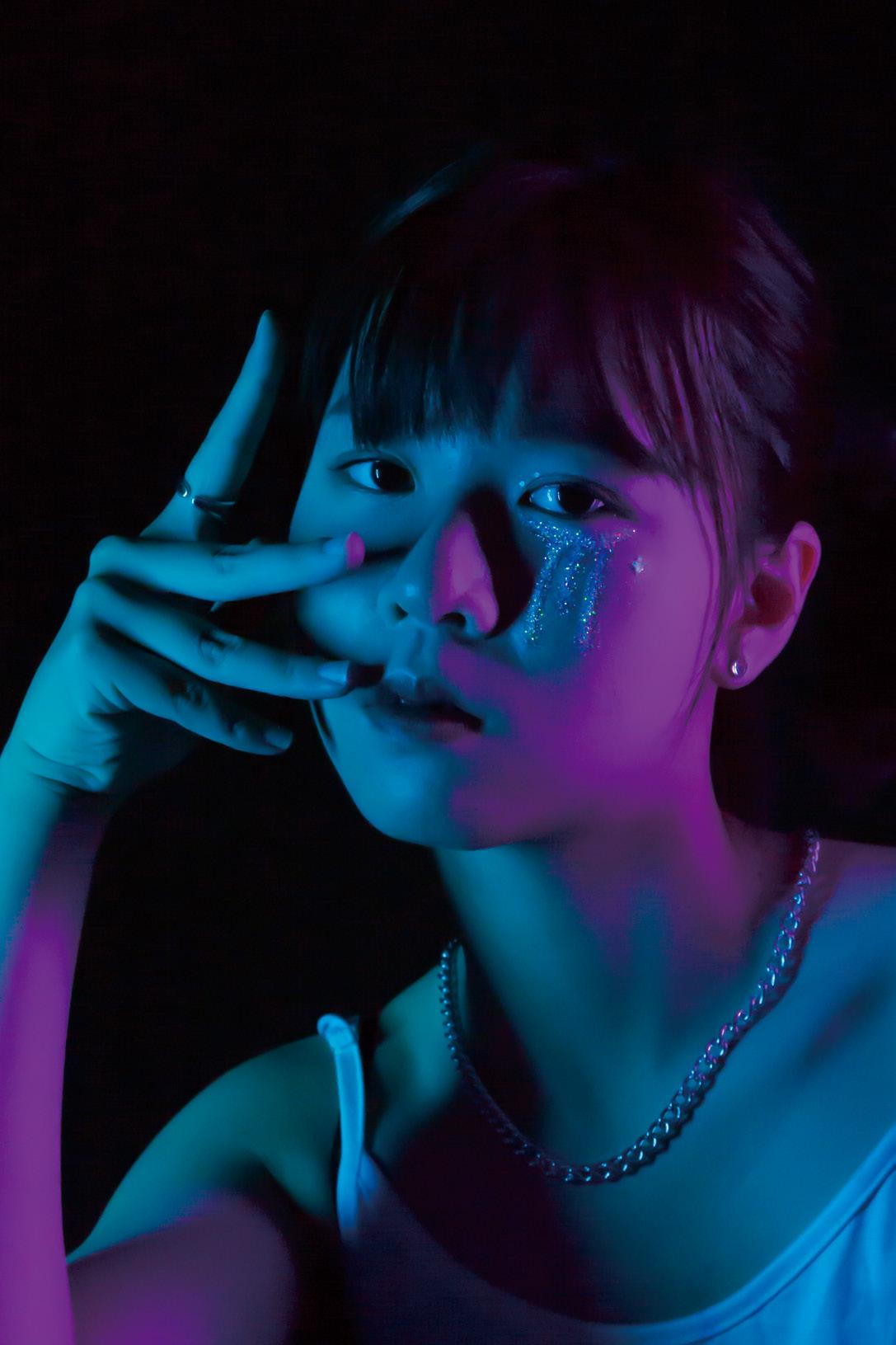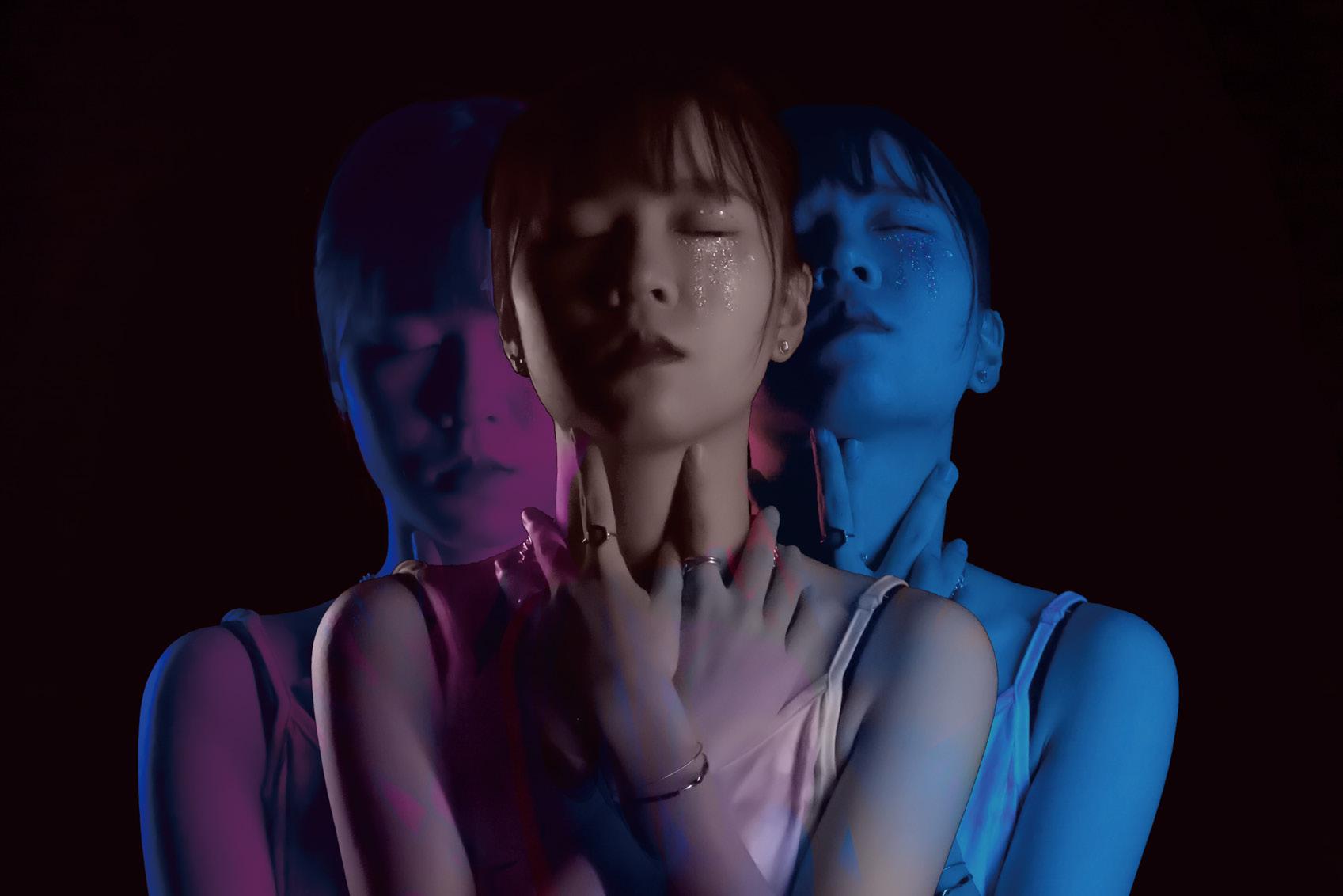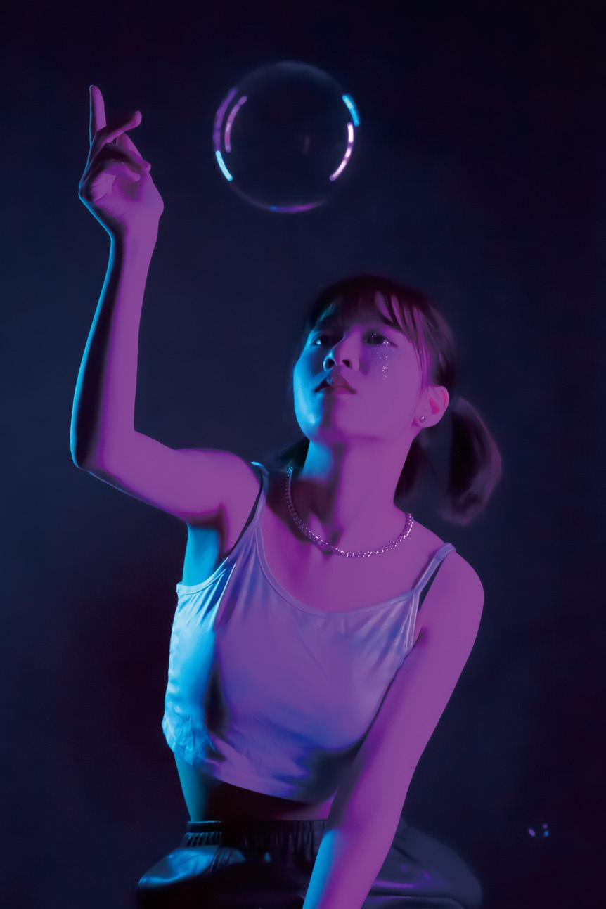 以藍紫色光創造出迷幻的氛圍,並幫模 特兒化特殊的眼妝,利用閃亮的淚水傳 達出雖然身處華麗的花花世界,卻仍感 到憂傷、窒息。將泡泡作為道具之一,凸 顯主題的虛幻意象。