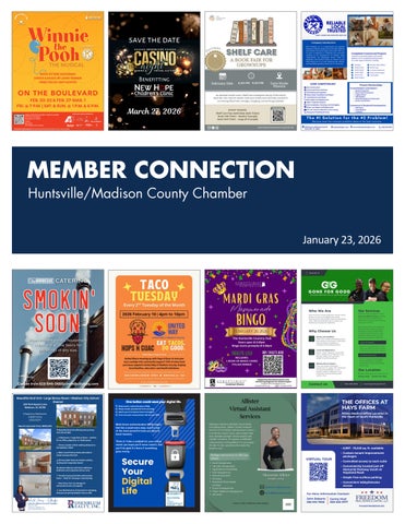 225 CHURCH ST NW, HUNTSVILLE, AL 35801 p 256.535.2000 | f 256.535.2015 | info@hsvchamber.org www.HSVchamber.org We distribute the Member Connection twice monthly. Want to be included in the next issue? Please send your flyers to membership@hsvchamber.org. Our Member Connection is a FREE service!