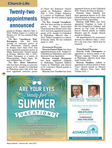 of Christ the Redeemer Church parish in Thibodaux, effective July 1, 2015. Father Sabaricos is a native of Tagbilaran, Bohol, Philippines. He was ordained April 10, 1991. The Rev. Joseph Varughese, who has been serving as associate pastor of Maria Immacolata Church parish in Houma since July 2013, has been appointed associate pastor of St. Joseph Co-Cathedral in Thibodaux, effective July 1, 2015. Father Varughese is a native of Kerala, India. He was ordained April 11, 1994. *** Permanent Deacons Deacon Daniel Blake has been appointed deacon at St. Joseph CoCathedral in Thibodaux and to the diocesan Prison Apostolate. Deacon Joseph Bourgeois has been appointed chaplain to Thibodaux Regional Medical Center in Thibodaux and deacon at St. Lawrence Church parish in Chacahoula. Deacon Lee Crochet has been