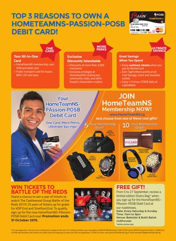 Stand a chance to win a pair of tickets to watch The Castlewood Group Battle of the Reds 2015! 25 pairs of tickets up for grabs for KOP End and Stretford End. To qualify, sign up for the new HomeTeamNS-PAssionPOSB Debit Card now! Promotion ends 31 October 2015.