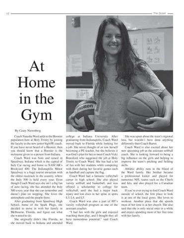 At Home in the Gym By Casey Nierenberg Coach Natasha Ward adds to the Hoosier population here at Holy Trinity by joining the faculty as the new junior high PE coach. If you have never heard of a Hoosier, then you should know that a Hoosier is the nickname given to a person from Indiana. Coach Ward was born and raised in Speedway, Indiana which is the capital of Indy Car racing and home to NASCAR’s Brickyard 400. The Indianapolis Motor Speedway is a huge tourist attraction with the oldest racetrack in the country, where the Indy 500 is held every year. Even though Coach Ward says she isn’t a big fan of auto racing, she has attended the Indy 500 every year that she can remember and doesn’t plan on stopping. She loves the atmosphere and the people there. After graduating from Speedway High School, home of the Spark Plugs, she decided to move in with her family in Melbourne, Florida, and figure out what she wanted to do. She originally didn’t like Florida, so she moved back to Indiana and attended