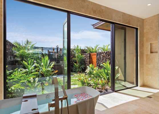 lānai or in bed. The suite’s walk-in closet is thoughtfully roomy and well designed, featuring custom built-in drawers and other areas for neatly storing clothing and accessories. In the adjoining bathroom, a freestanding soaking tub is conveniently situated alongside an expanse of windows, which grants the bather a perfect sight line to the lava-rock-walled outdoor shower and luxuriant tropical garden.