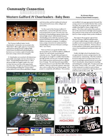 By Almena Mayes Photo by Mykel Media Company are modified to be age appropriate but push the young women to do and be the best they can be. Secondly, the program allows elementary and middle school girls to cheer at high school games. The cheers and routines they perform are on the same level as the high school squads; they perform in the stands and on the field. The fans love them and give them positive feedback. The support the program is given from the fans, parents, staff and administration of Western Guilford helps to build a spirit of excellence and consequently drives the girls to do their very best at all times. The love shown to the members of this junior squad ushers in a sense of accomplishment and boosts their selfesteem. Finally, the high school cheerleaders have an opportunity to mentor and give back to the community by volunteering. All of the students involved realize that to progress they have to reach out and help someone else be successful. The JV cheerleaders all participate in teaching and training the younger girls. Practices end with the chant “whose world…our world”. The truth in this statement is evident as each of these young women is prepared to take her place and make her mark on the world.