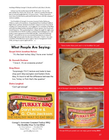 teaching of Bishop George W. Brooks and First Lady Edna G. Brooks. Jackson says his mother impacted his life the most. He says she showed him how hard work can pay off. Jackson’s mother introduced him to God and taught him how to trust in Jesus. “When I learned to trust Jesus, he directed my path and He laid me here with this company,” Jackson explains. Vice President of George’s Awesome Gourmet Turkey Barbecue, White is a native of Greensboro. He graduated from Southeast Guilford High School and later obtained a bachelor’s degree in music from North Carolina A & T State University. As an aggie he was a member of the Blue and Gold Marching Machine and played with jazz greats, Max Roach and Lionel Hampton. After graduating from college, he taught for eight years as a band director in North Carolina, Louisiana and Washington, D.C. and made a cameo appearance in the Hall Mark film, “What the Deaf Man Heard”. Currently he serves as an assistant band director at James B. Dudley High School under the direction of Ricardo V. Reid Sr. He is also a member of the illustrious sports agency Sports Management World Wide, serving as a sports agent advisor.