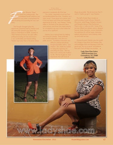 things are possible. She let me know that if I want it, I better go get it,” says Hairston. The staff of Lady Shae includes six stylist including Crystal Johnson, Kimberly Moorman, Jodie Briggs, Kimberly Johnson, and Kenyetta Johnson (Nail Technician). There is also a make-up artist. Some of the services offered are relaxers, perms, designer haircuts, styles, haircolors, various treatments, hair extentions for all hair types, manicures, eyelash extententions, brow shaping, makeup and bridal services. Moving forward, Hairston says she would not change a thing about her business. She acknowledges there are blessings in both the good and “the not so good” and believes that with God, all things are possible. Lady Shae Hair Salon 1025 Homeland Ave Greensboro, NC 27405 (336)333-3222