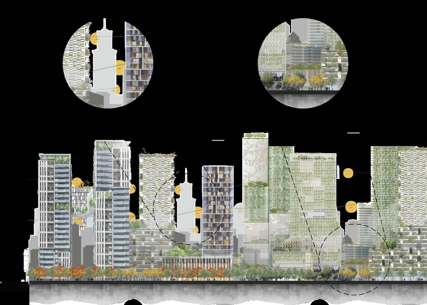 大眾運輸高架化,增加 便捷性也可減少二氧化 碳排放。車廂穿梭在大 樓內就像是都市中的流 星。