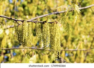 Oak trees are a flowering tree species and they begin to bloom in the spring. The yellowish green flowers are mostly unnoticed because they appear like new unfurled leaves from a distance. After spending several months in cold winter and snow, the warm spring aids the blooming of flowers, buds and leaves The Oak trees are monoecious which means that both male (staminate) and female (pistillate) flowers are present on the same tree The male flowers appear as strings of beads hanging (catkin) from newly developed branches