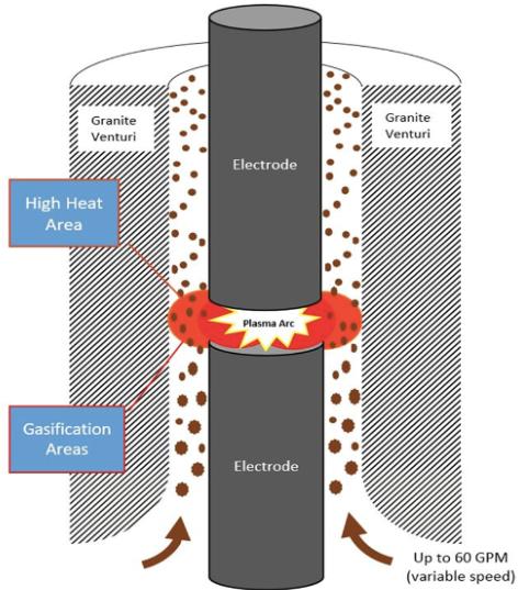 A really high electric current is sent between two electrodes in an electrical arc gasifier to form an arc in this process The high pressure inert gas then travels across the electrical arc and into a closed container of waste products (referred to as a plasma converter). With over 14,000 °C in temperature, the arc column is hotter than the Sun's surface When exposed to these temperatures, the majority of trash is converted into gas made up of the simplest elements, whilst complex compounds are broken down into individual atoms