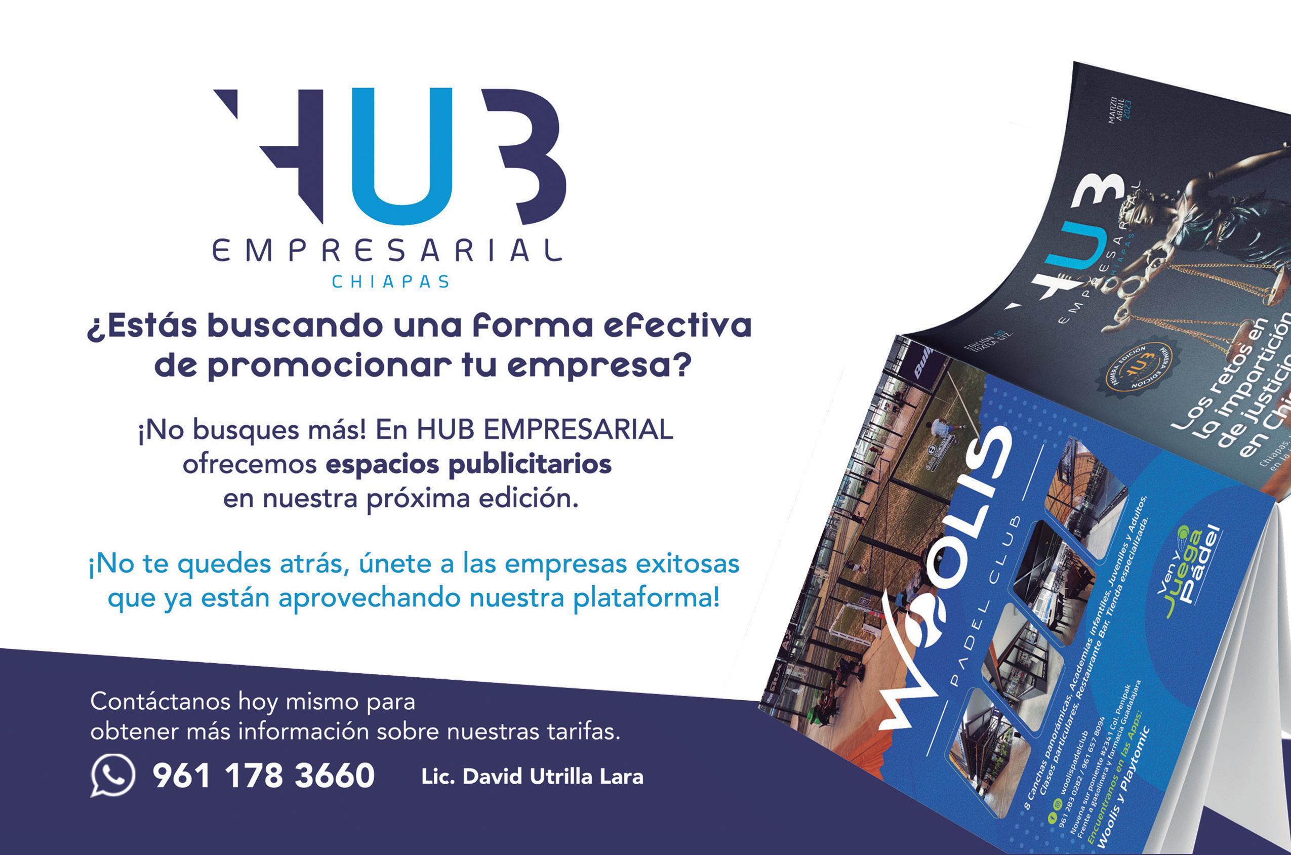Anunciarse en HUB es efectivo y de gran alcance por ser una revista de distribución gratuita lo que permite que el “ pass along” (1) se calcule entre 3 a 5 personas. Además tiene una tiraje de 4 mil ejemplares que se distribuyen en hoteles, restaurantes, cafeterías y diversos centros de distribución de gran afluencia.Así como en las principales ciudades de la entidad como: Tuxtla Gutiérrez, San Cristóbal de las Casas, Comitán y Tapachula.