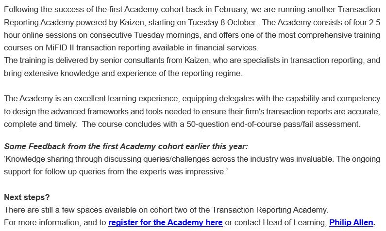 PIMFA Transaction Reporting Academy - cohort 2 starts on 8 October