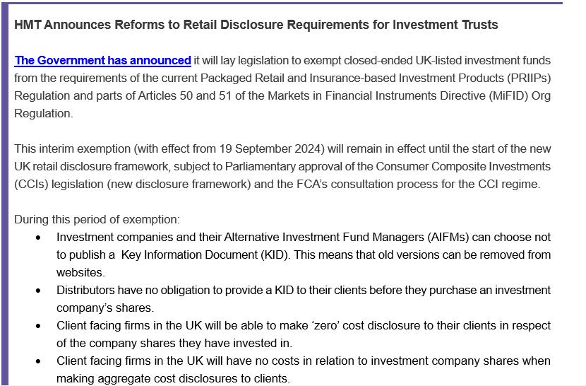 HMT Announces Reforms to Retail Disclosure Requirements for Investment Trusts