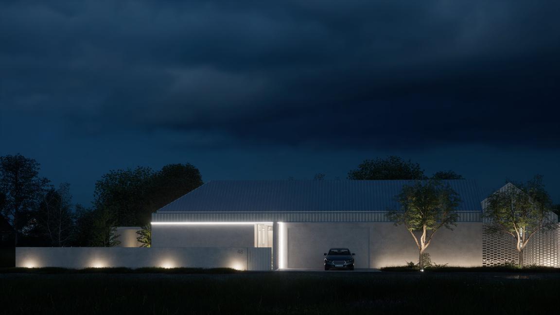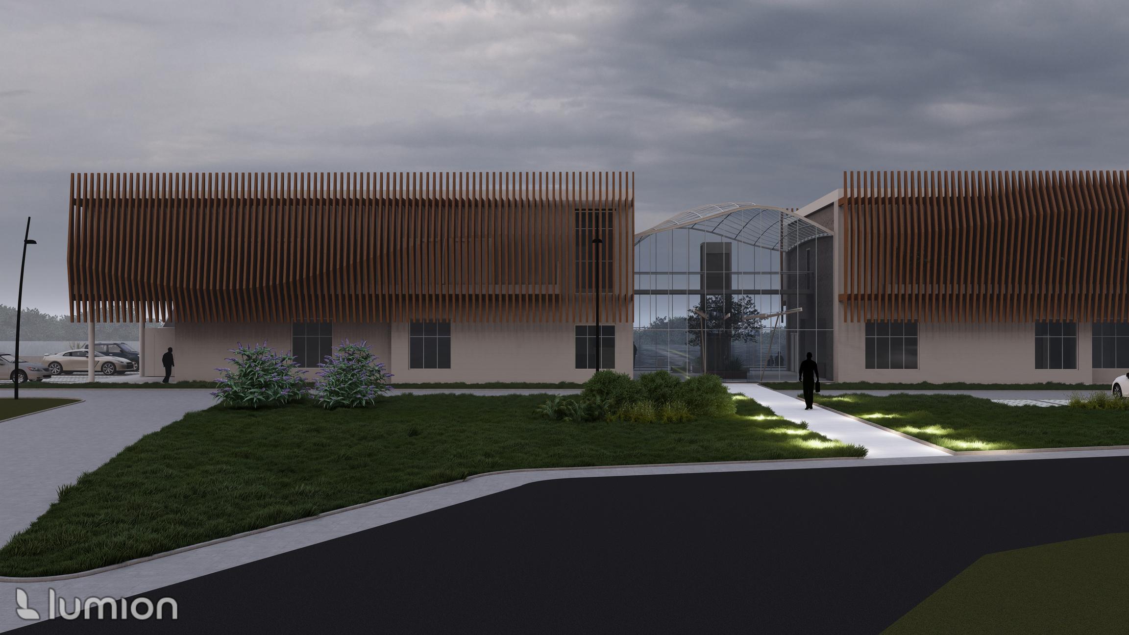 Do moich obowiązków przy tym projekcie należało zaprojektowanie przestrzeni wokół budynku oraz wykonanie wizualizacji dziennych i nocnych obiektu.