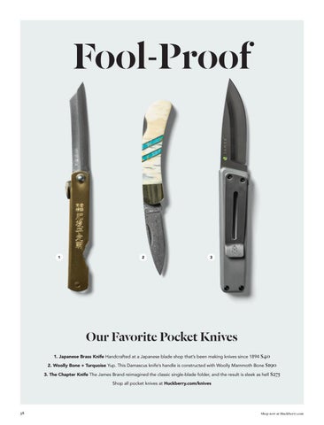 Our Favorite Pocket Knives 1. Japanese Brass Knife Handcrafted at a Japanese blade shop that’s been making knives since 1894 $40 2. Woolly Bone + Turquoise Yup. This Damascus knife’s handle is constructed with Woolly Mammoth Bone $190 3. The Chapter Knife The James Brand reimagined the classic single-blade folder, and the result is sleek as hell $275 Shop all pocket knives at Huckberry.com/knives