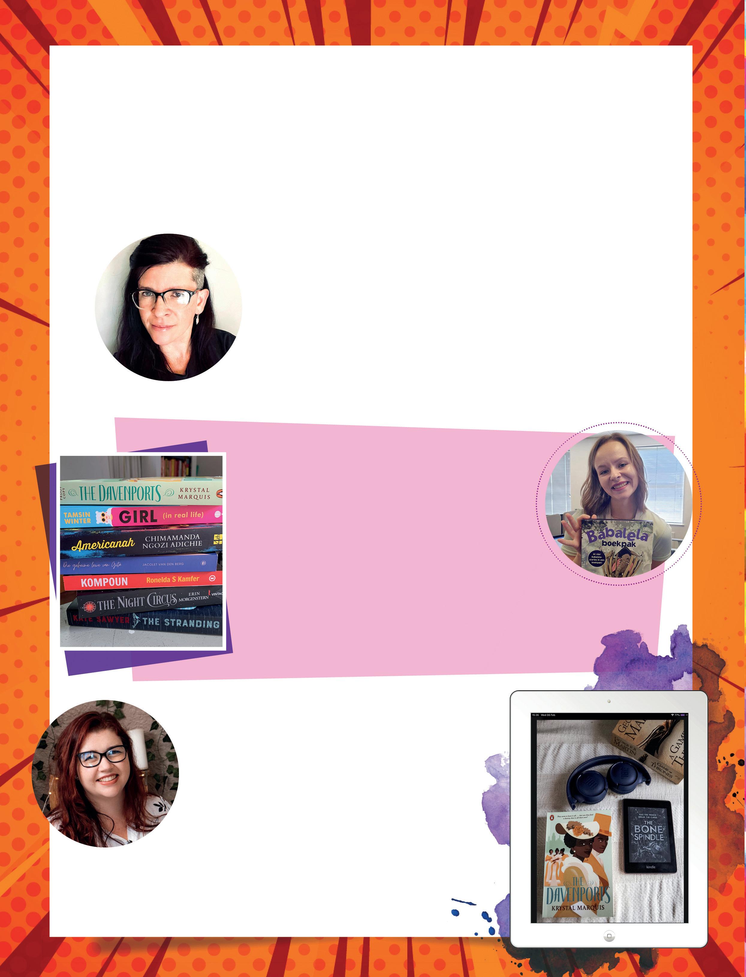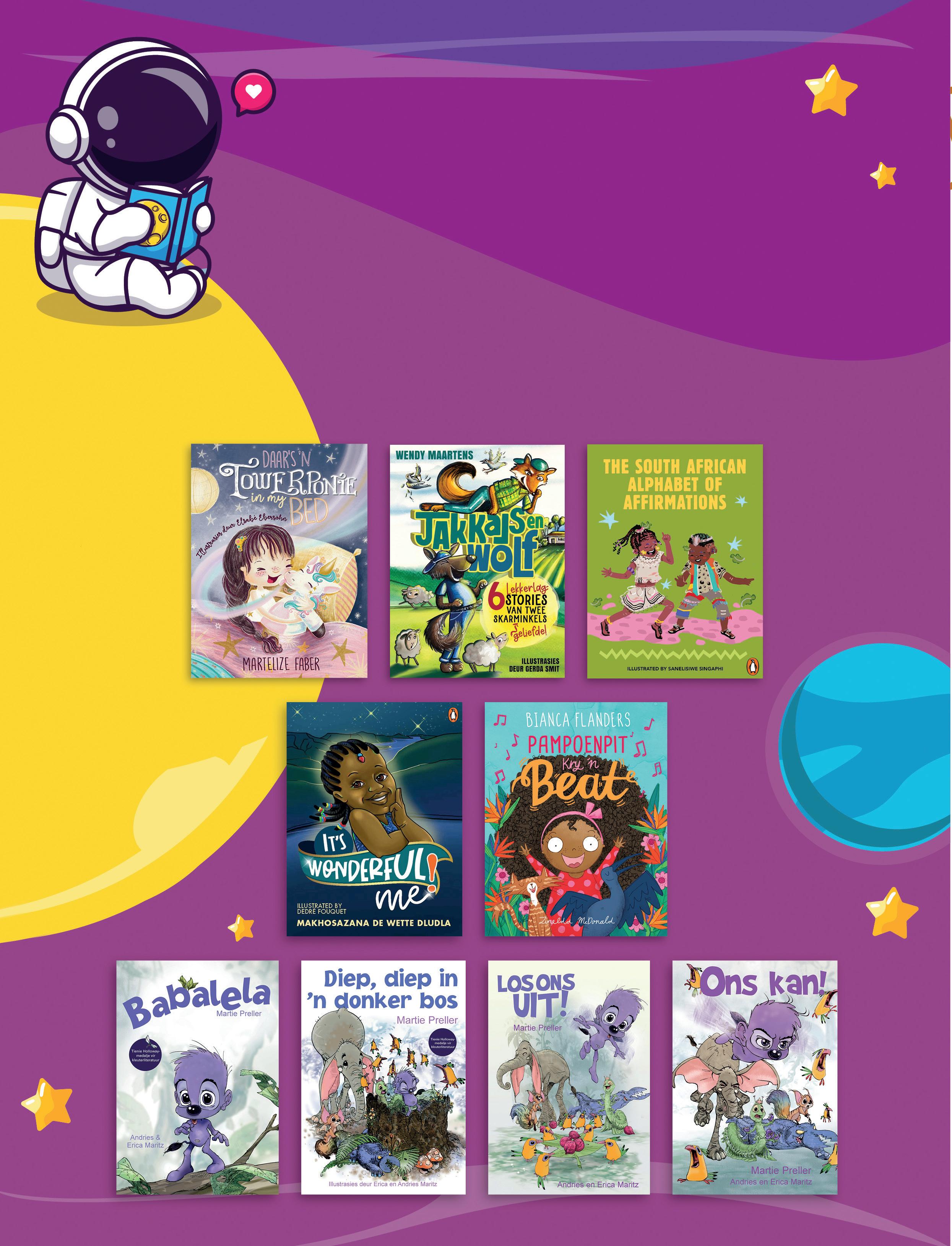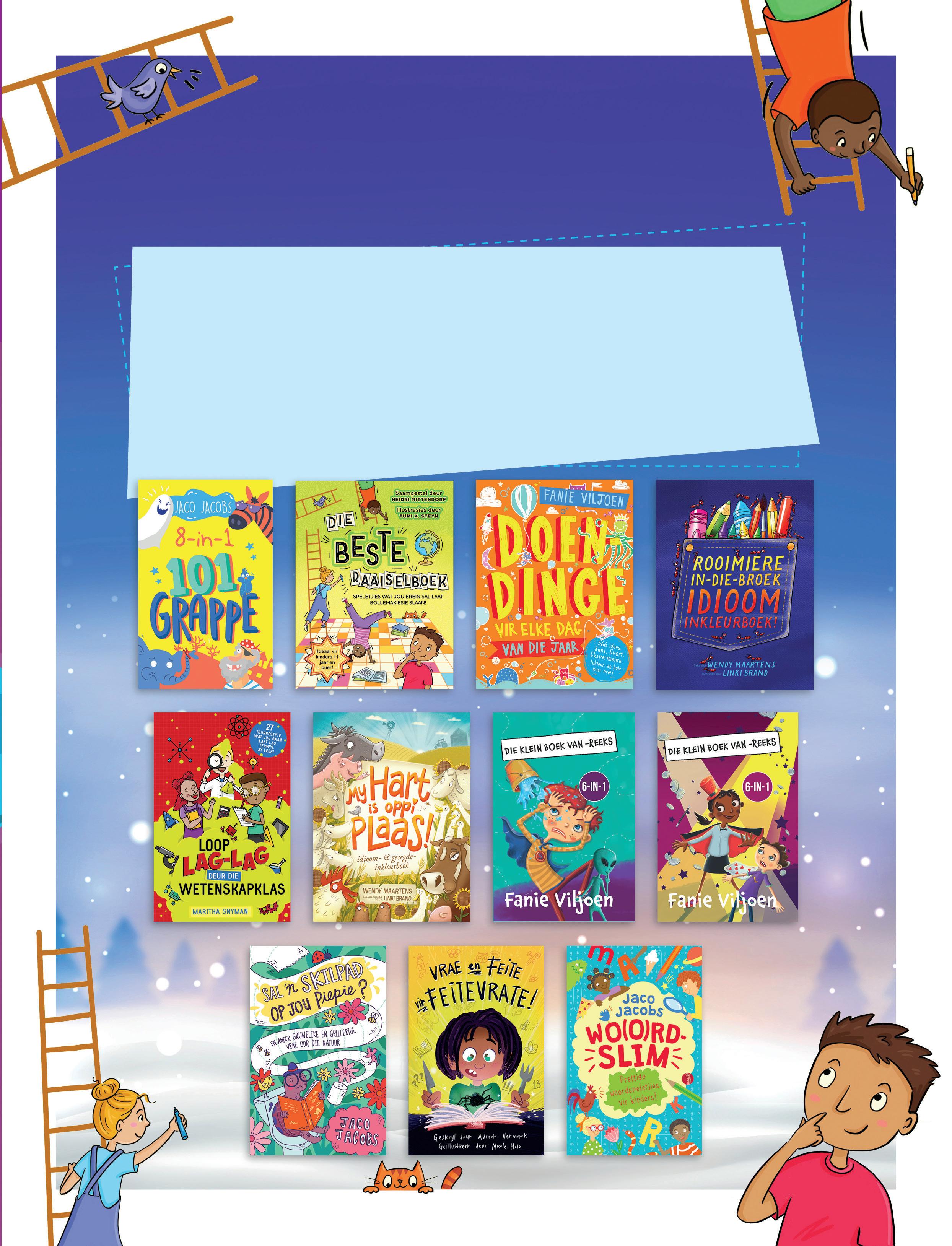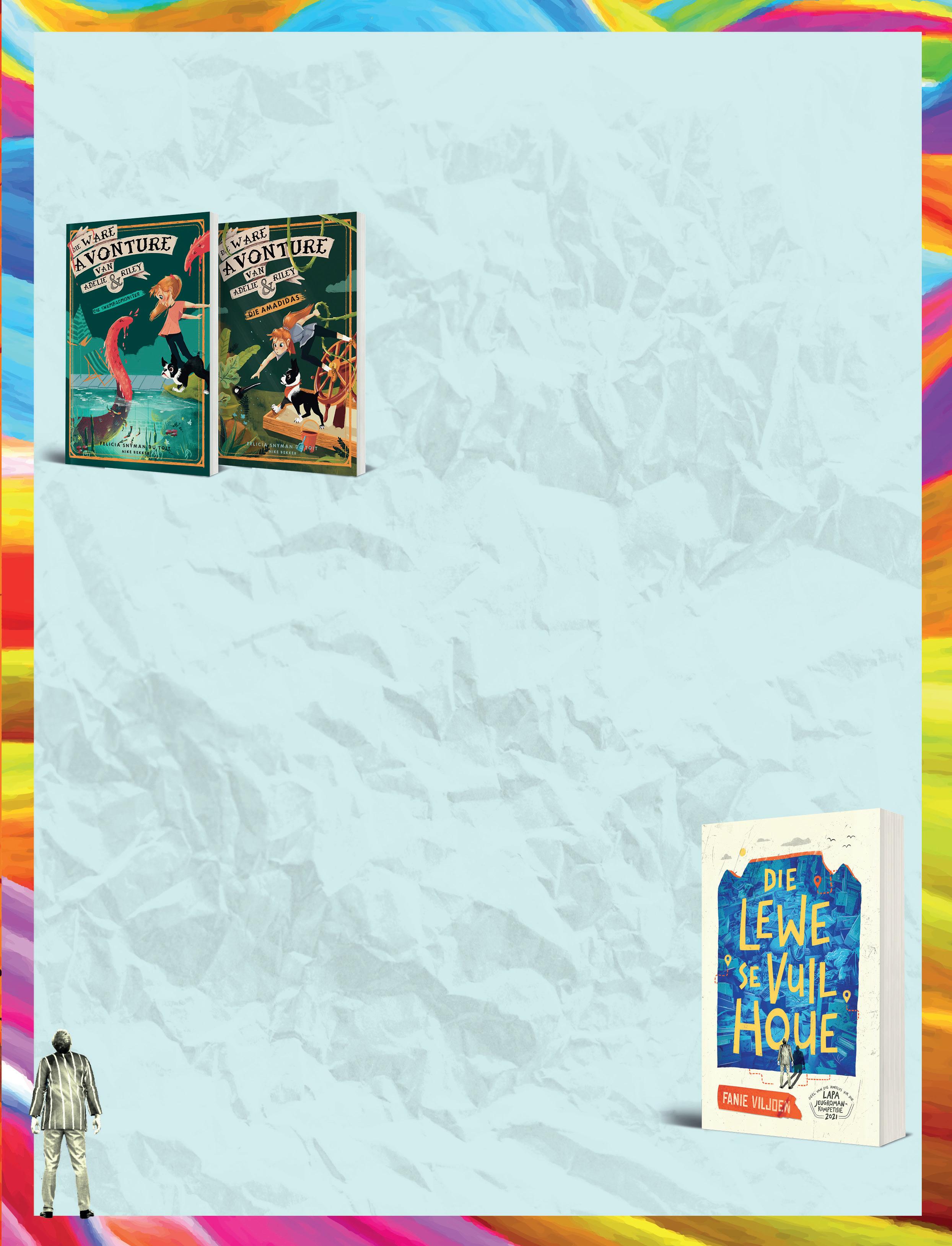 My grootste taak as bemarkingsbestuurder van plaaslike kinder- en jeugboeke, maar een waaroor ek gelukkig baie passievol is, is om JOU te help om die regte boek te kies –dalk vir jouself of dalk vir jou kind. Want, glo dit of nie, almal het ’n boek wat perfek by hulle pas. Elke pot het ’n spreekwoordelike (boek)deksel. Of jy nou hou van avonture, romanse, komedie, sport, spoke, stoomtreine of ’n boek met meer prentjies in as woorde, daar is iets op ons boekrak vir jou. Tussen die blaaie van hierdie tydskrif is daar ’n magdom van voorstelle, maar dis net al ons nuutste boeke. Vir nog ’n klómp leesidees kan jy ons webwerf besoek of op ons sosialemediabladsye gaan rondspeel. Jy sal iets vind wat jou of jou kind opgewonde gaan maak.