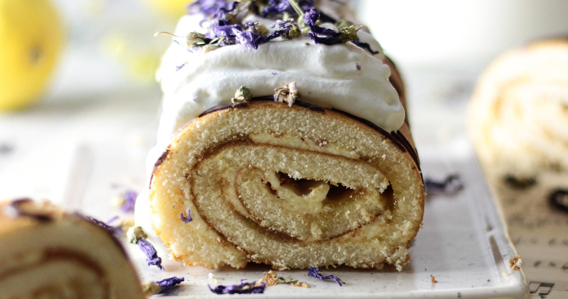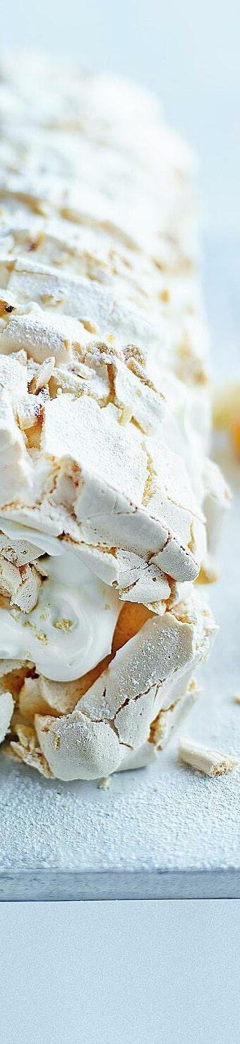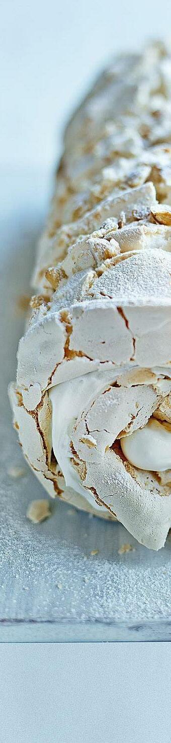 Once the meringue has cooled fullym, gently remove it from the grease proof paper and lay it on a surface dusted with icing sugar. Layer the cream filling and lemon curd on the meringue and very gently roll the meringue into a roly poly and serve.
