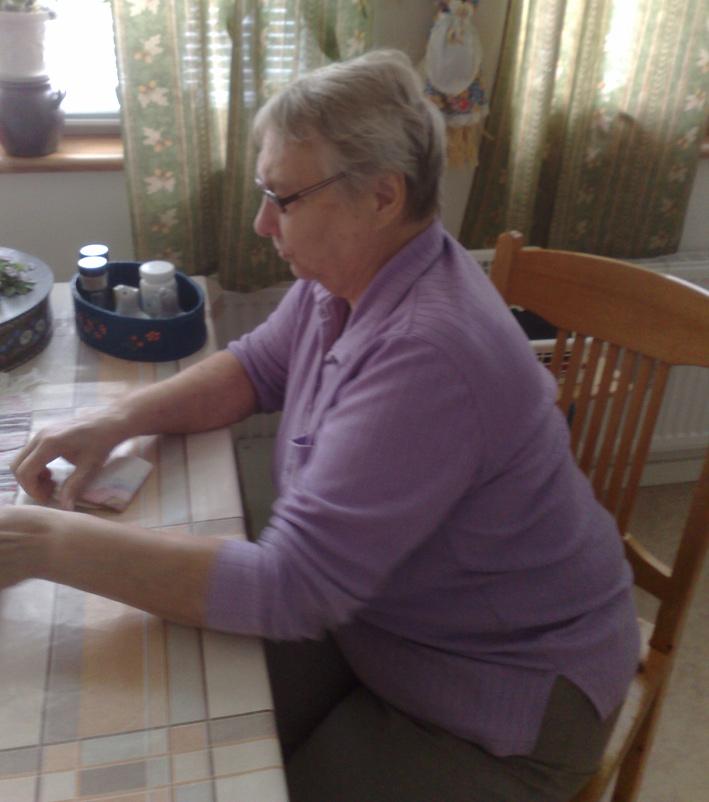 Anledningen till att hon flyttade från Centralgatan till Skolgatan är att hon har något svårt för att gå. På Skolgatan slipper jag trappor och backar. När man har ständig värk i kroppen och speciellt i ben och höfter underlättar det att slippa gå långt och i trappor säger hon.