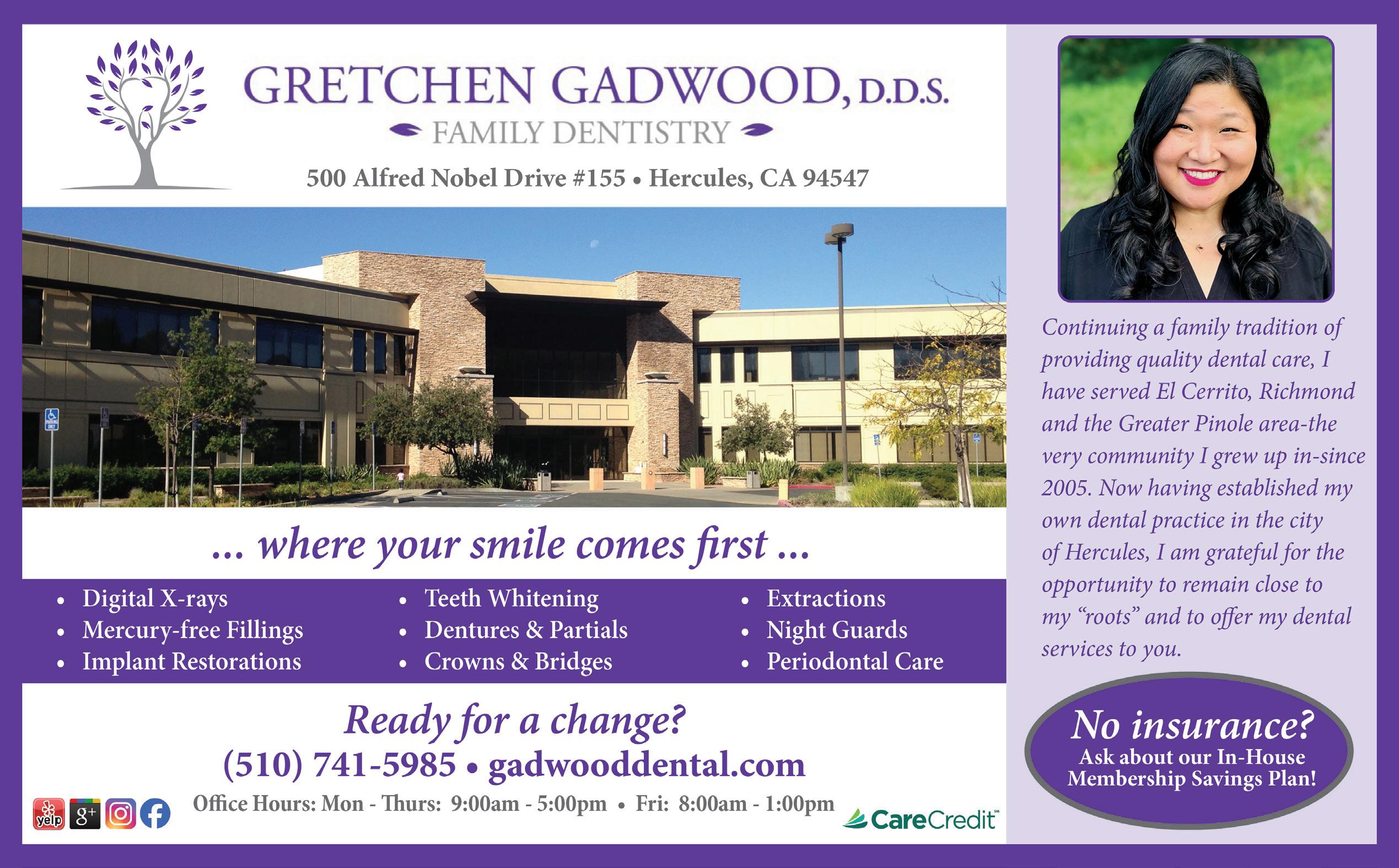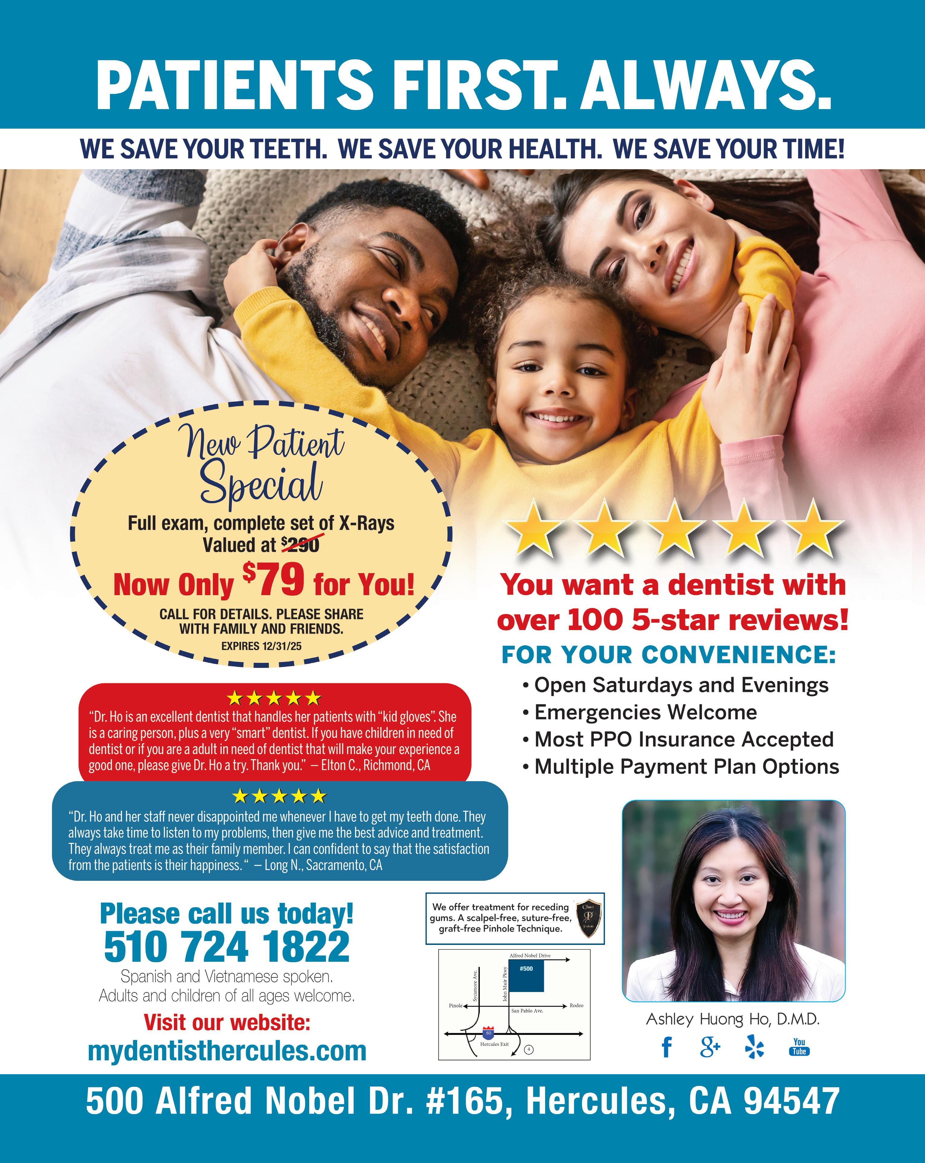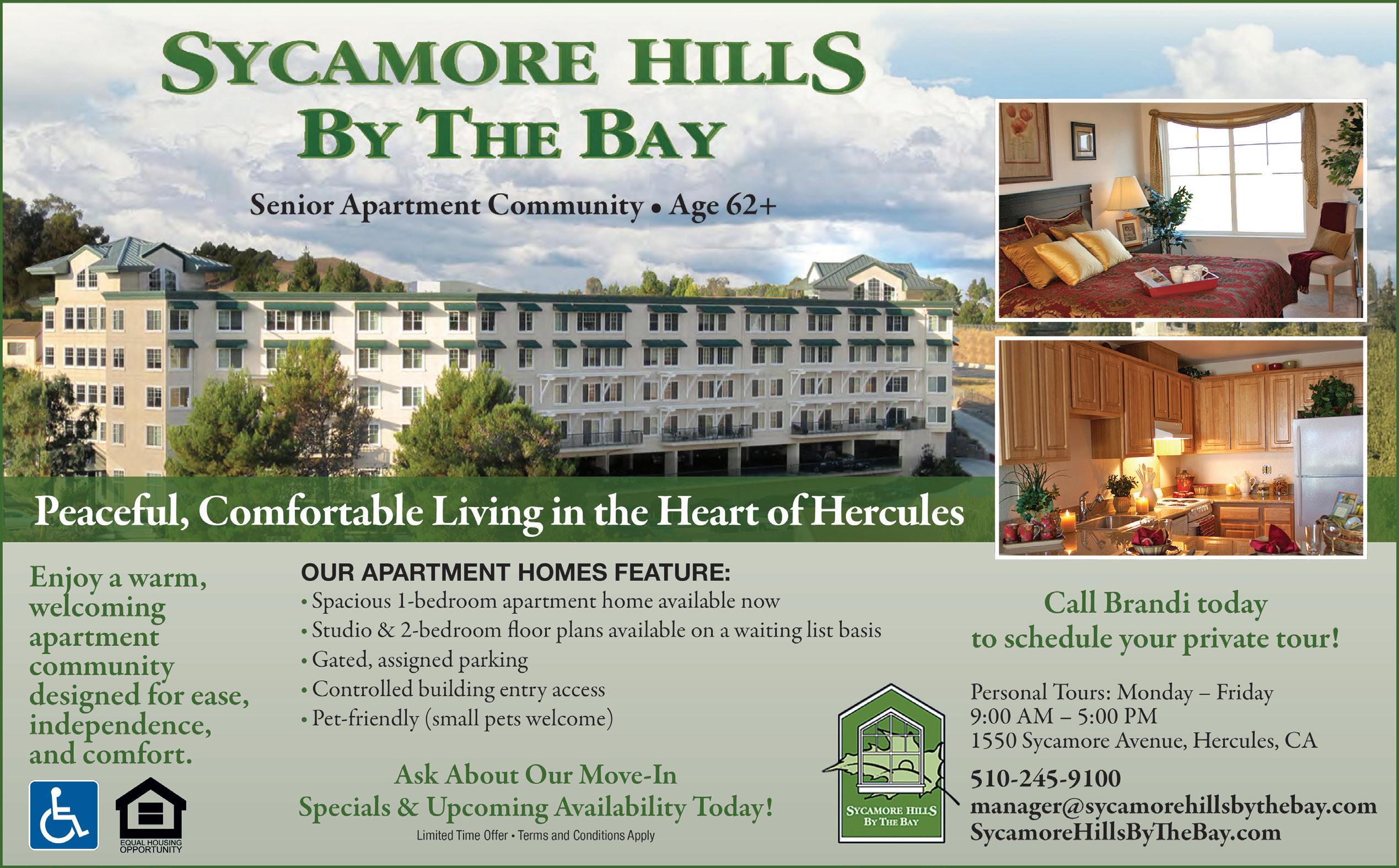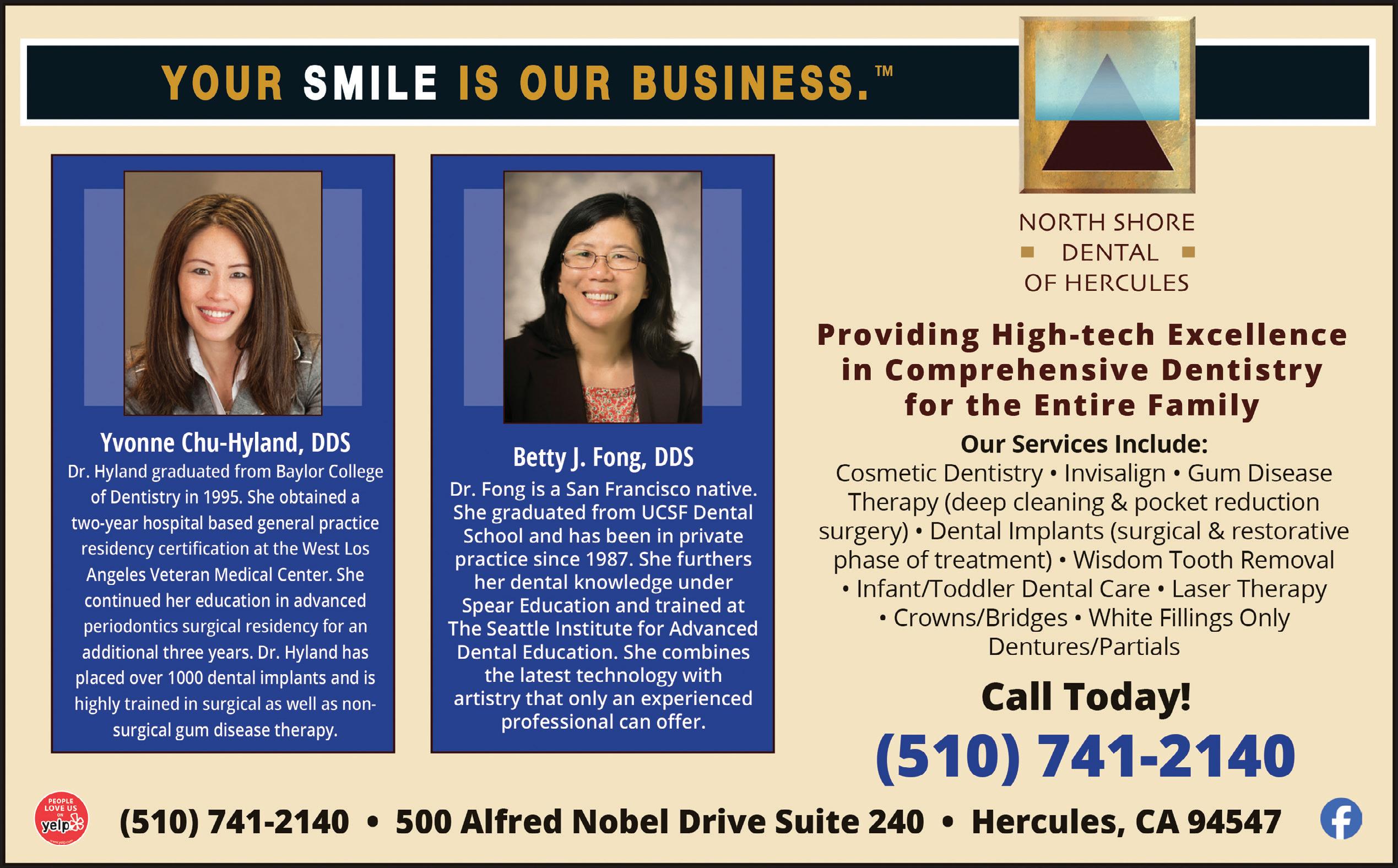 This month, we are excited to have some advertisers back, including Eastshore Pediatric Dental Group (pg. 33) with Dr. Kim and Dr. Thea, and Sycamore Hills By The Bay (pg. 7), a Senior Apartment community in