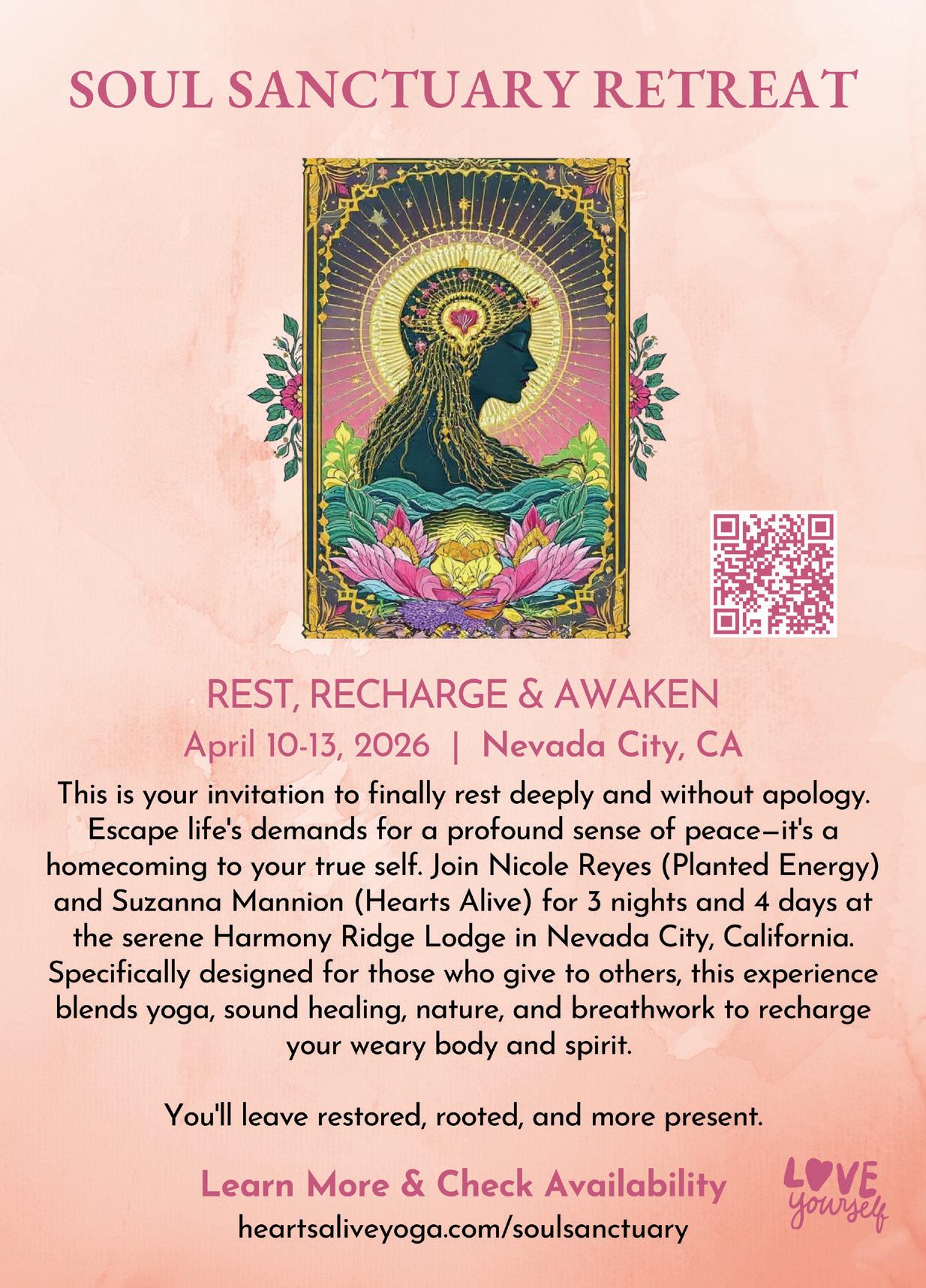 Register for the Hearts Alive and Planted Enegy Soul Sanctuary Retreat, April 2026 in Nevada City.